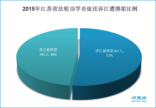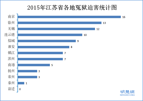 二零一五年,江苏省迫害致死法轮功学员三人;非法批捕、起诉、庭审、判刑法轮功学员九十四人次,其中,一半以上为二零一五年当年被绑架(五十三人,约占百分之五十六),占二零一五年总绑架人数的百分之九,五十三人次中,十五人因诉江(即控告江泽民)被非法批捕、起诉、庭审或判刑,约占百分之二十八。即一百名被绑架的法轮功学员中,九人将遭冤狱迫害,接近绑架十人即判刑一人的比例;而遭冤狱迫害的法轮功学员,十人约有三人因依法诉江而遭逮捕。
