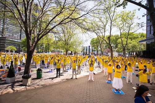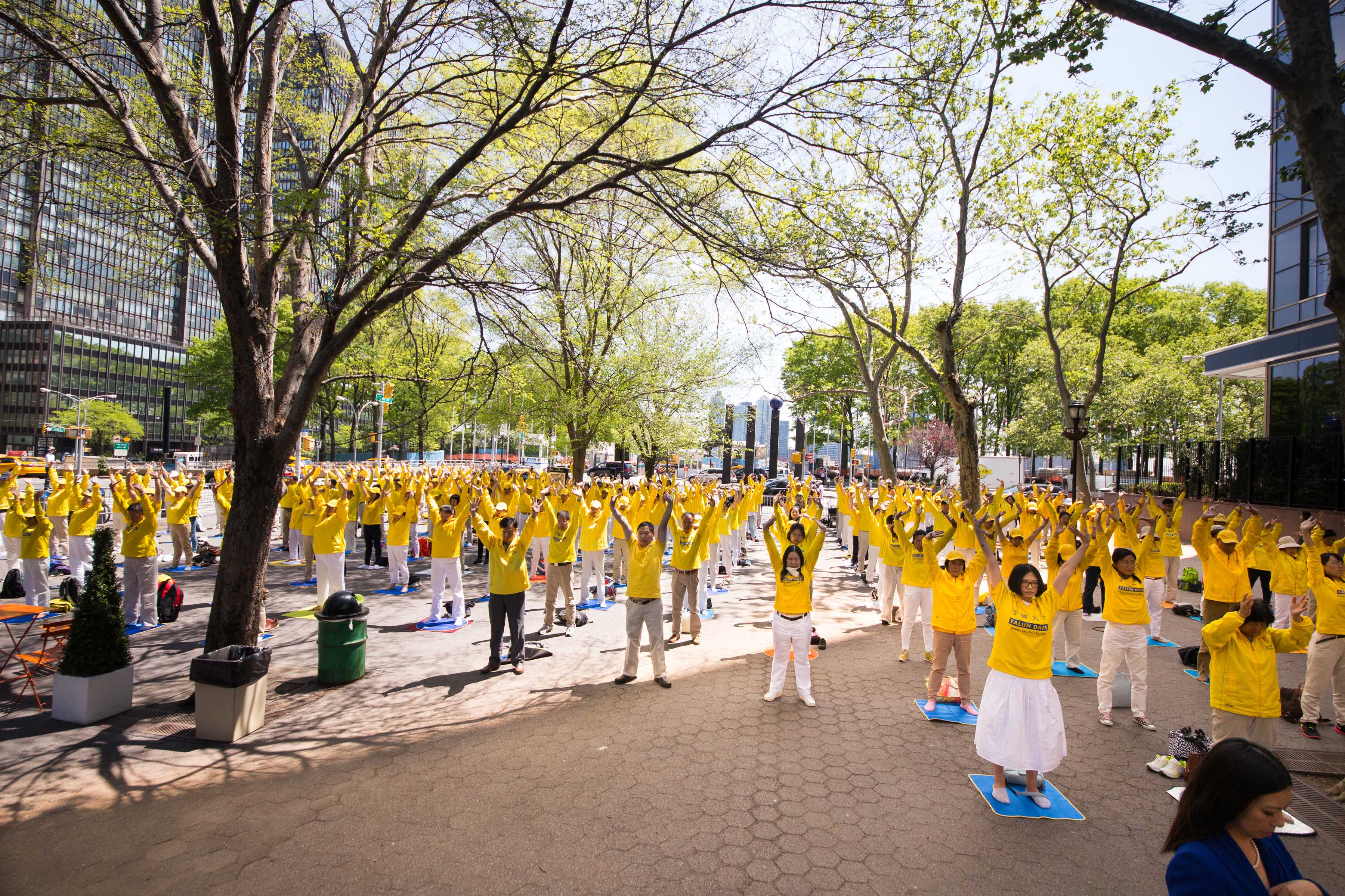 法轮功学员身穿“法轮大法好”黄色体恤衫,在灿烂阳光的照耀下,呈现金黄一片的亮丽风景;而在曼哈顿的车水马龙环境中,伴随祥和美好炼功音乐专注打坐的一个硕大的安静的人群,又恰如一块飞来的净土。集体炼功的法轮功学员吸引了过往民众的关注,其中包括那些往往脚步匆匆的联合国工作人员,他们中不少人接过真相传单,还有一些人停下脚步认真聆听法轮功学员深入讲解真相,并签名谴责中共迫害法轮功。