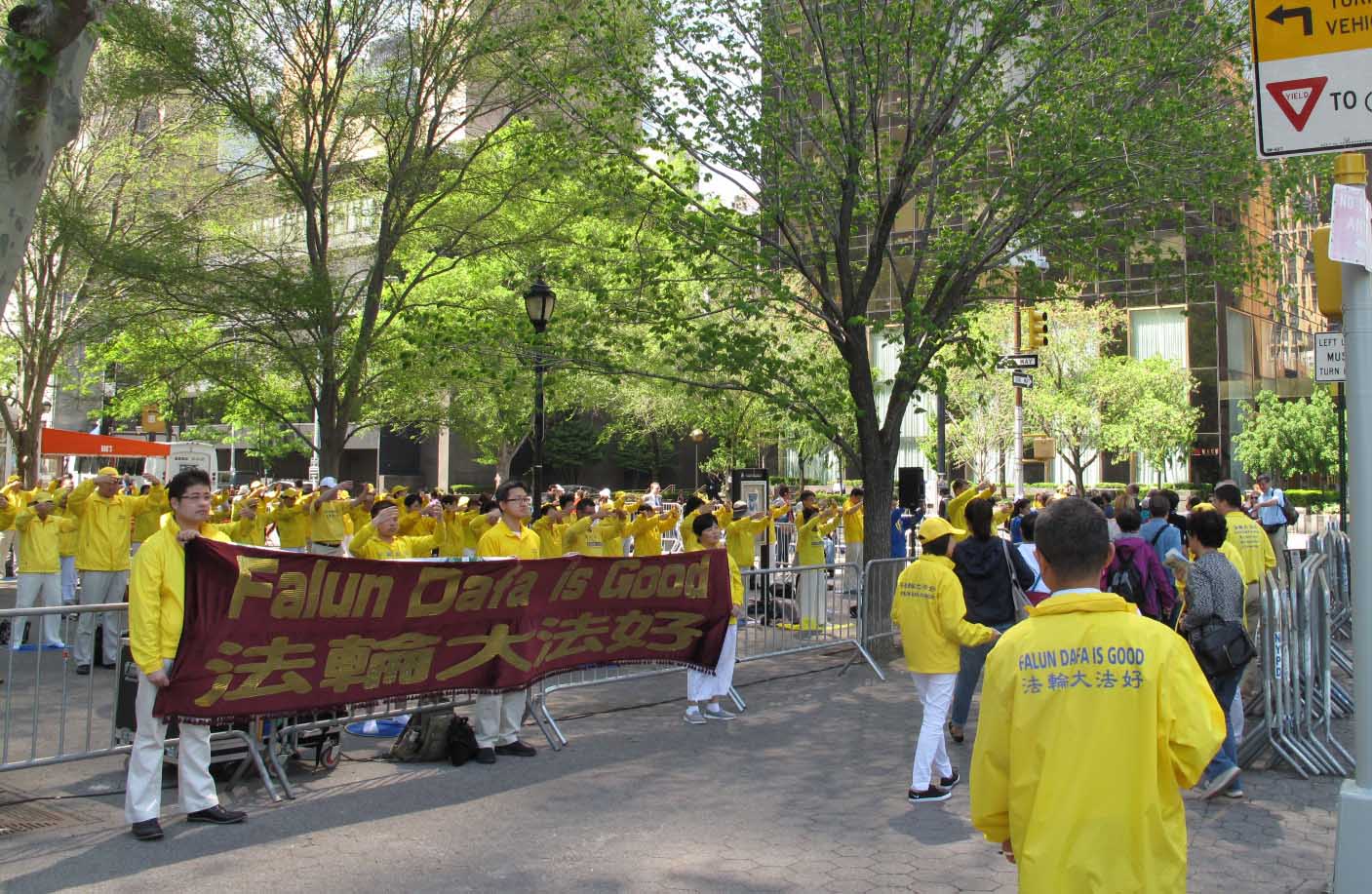 ![]() 图1-4:庆祝“五一三”世界法轮大法日,二零一六年五月十二日,部分来自世界各地的法轮功学员来到位于在曼哈顿二大道旁的联合国达格•哈玛绍广场公园(UN Dag Hammarskjold Plaza Park)集体炼功,展示大法的美好,传播大法的真相。 |