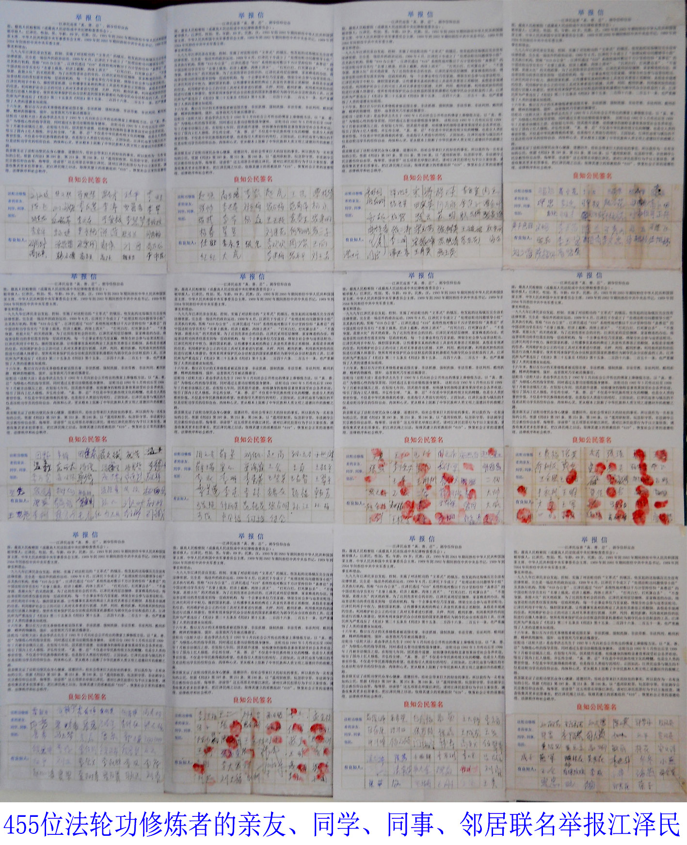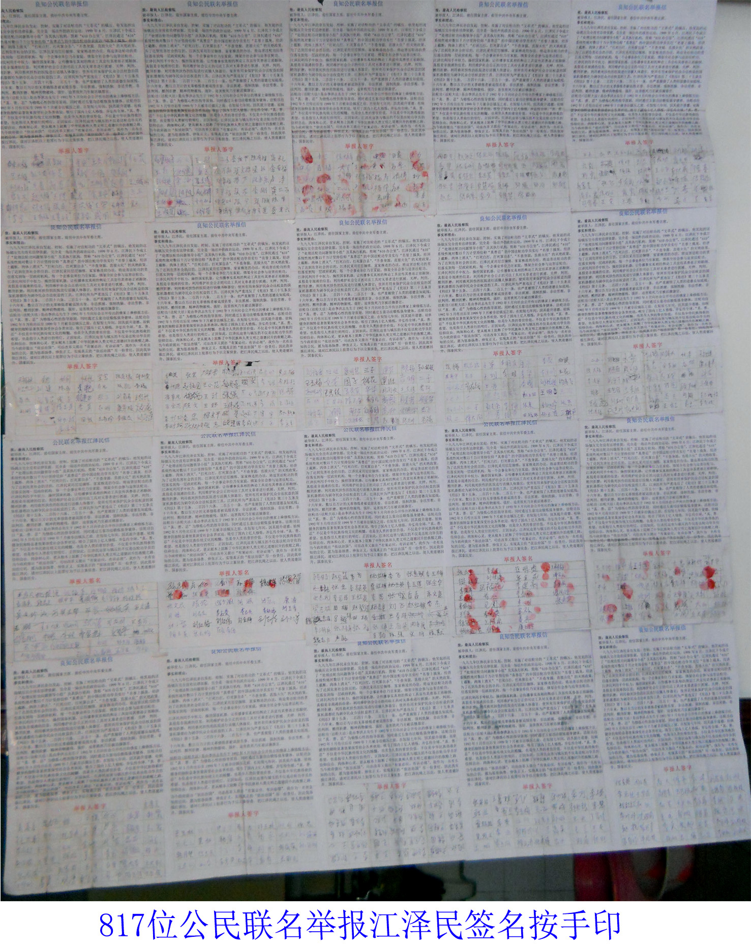 公民举报江泽民的举报信正面以图、文列举了江泽民与中共活摘法轮功学员器官以牟暴利的事实。背面是“公民联名举报江泽民信”。信中写到:一九九九年江泽民亲自发起、控制、实施了对法轮功的“文革式”的镇压。江泽民所为严重违反了《宪法》第三十五条及《刑法》第十五条、二百四十六条、二百五十一条,也严重摧毁了人类的道德良知底线。十六年来,数以百万计的无辜修炼者被诋毁名誉、非法抓捕、强制洗脑、非法劳教、非法判刑、酷刑折磨、精神药物摧残、强奸、迫害致死乃至被活摘器官。