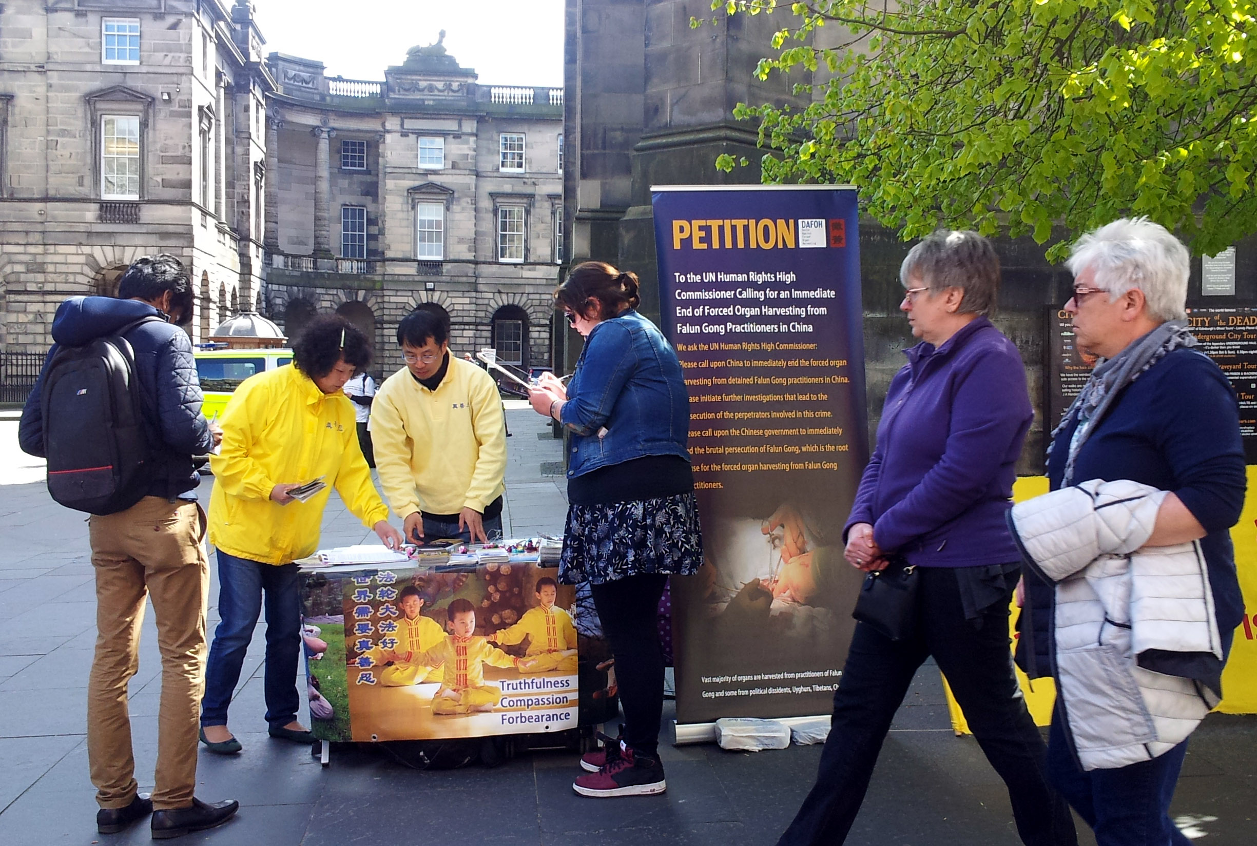 爱丁堡是著名的旅游城,市政厅是游客必到之处,来自世界不同国家的游客络绎不绝。当天的活动从上午十点到下午五点,法轮功学员集体炼功,派发真相传单并进行谴责中共活摘法轮功学员器官的征签。很多游客驻足观看,对法轮功功法演示连连称赞,在了解真相后郑重地签名反迫害。