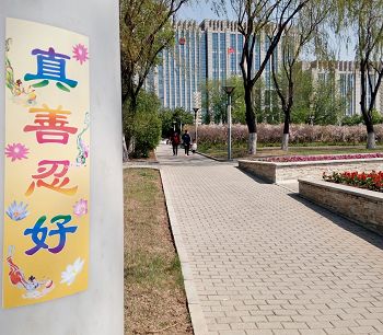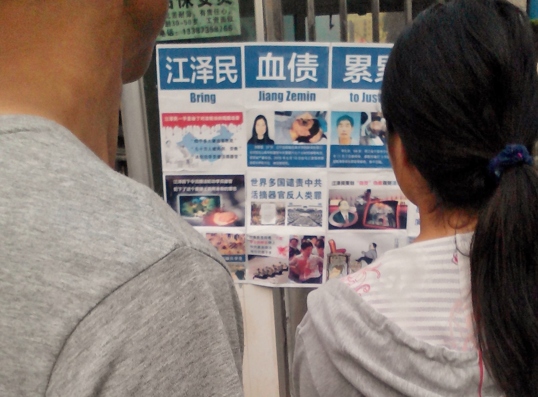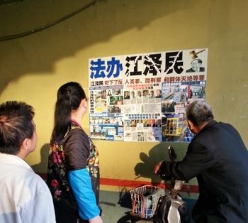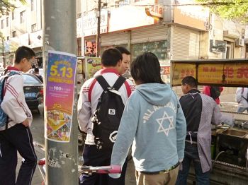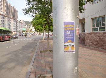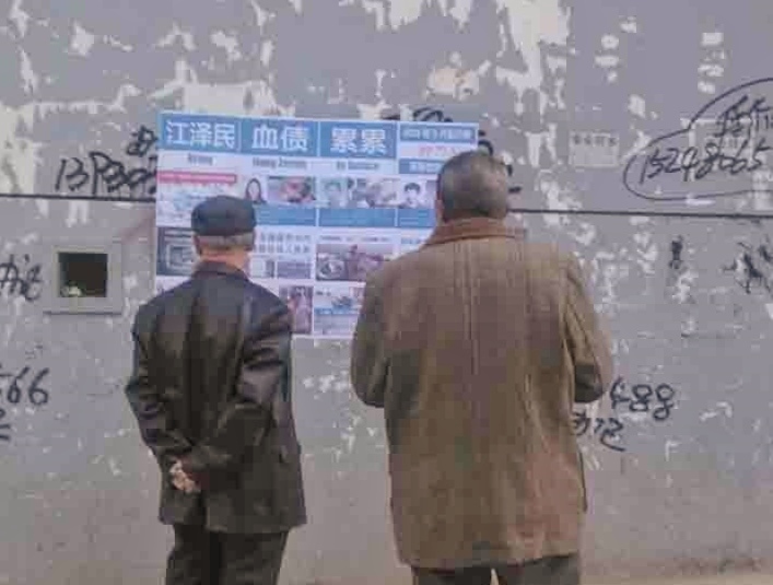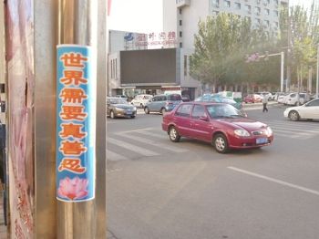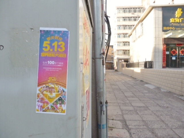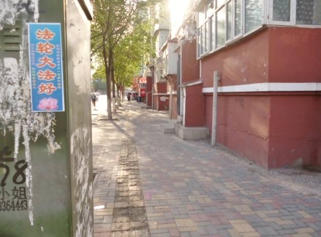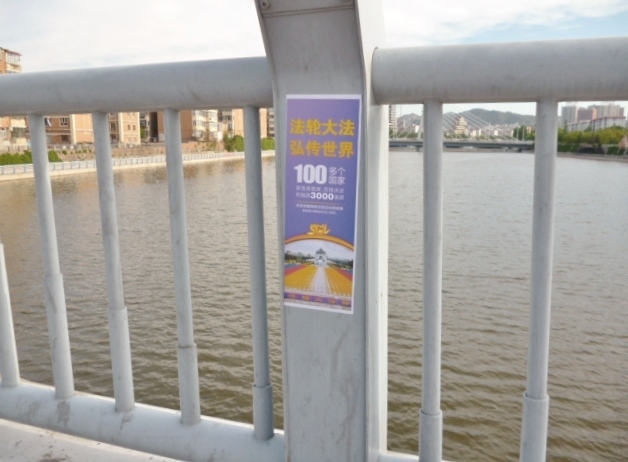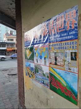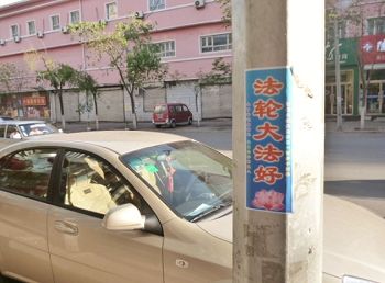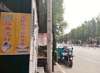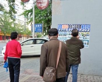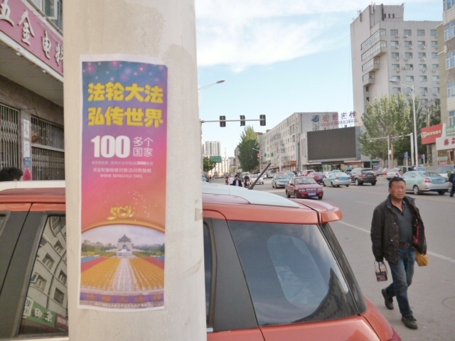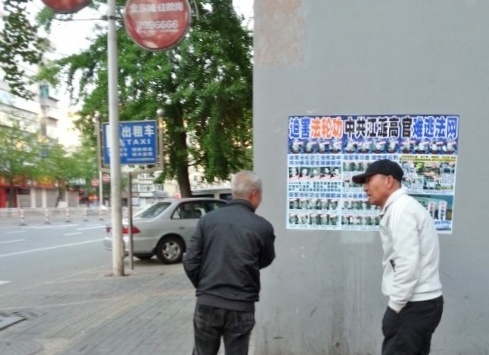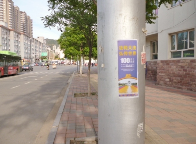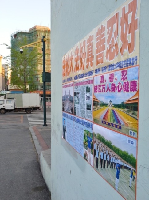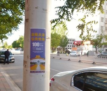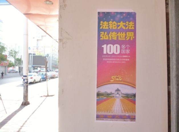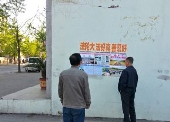 为庆祝五一三世界法轮大法日,丹东地区法轮功学员在大街小巷张贴真相展板和粘贴,将法轮功洪传世界和法轮功学员控告江泽民的信息传递给当地百姓。真相展板吸引路人观看。