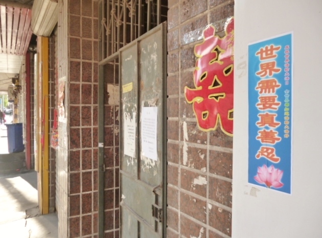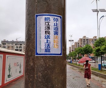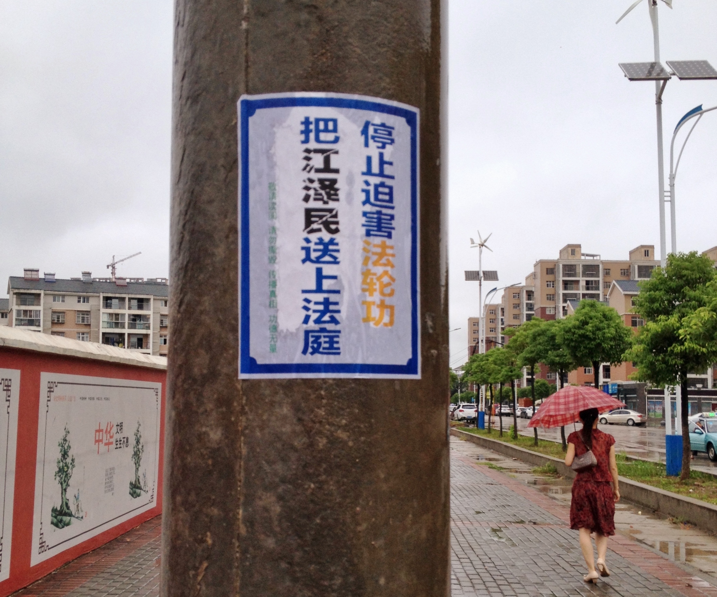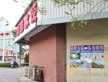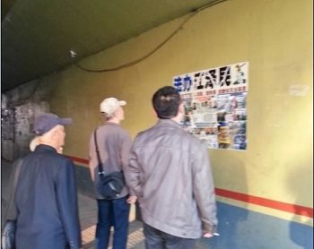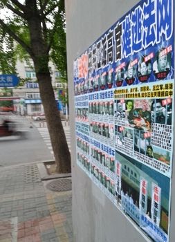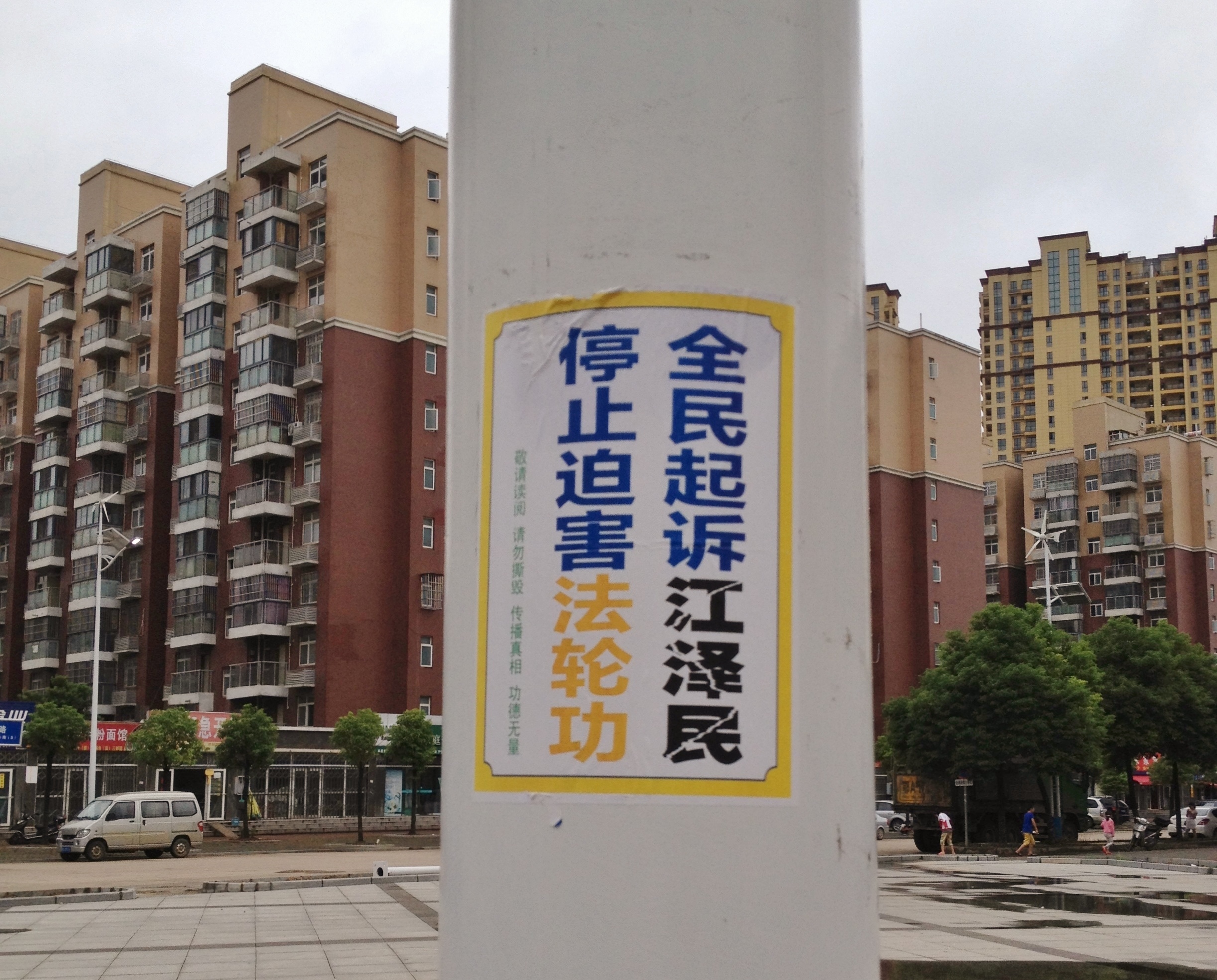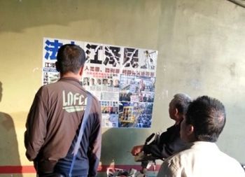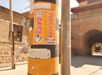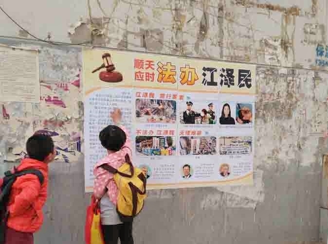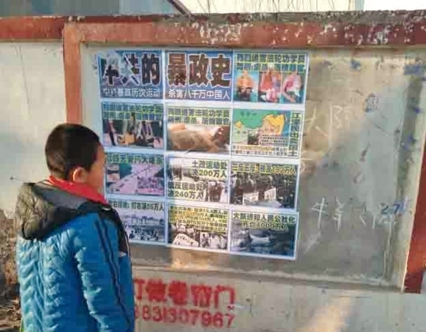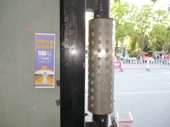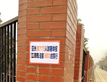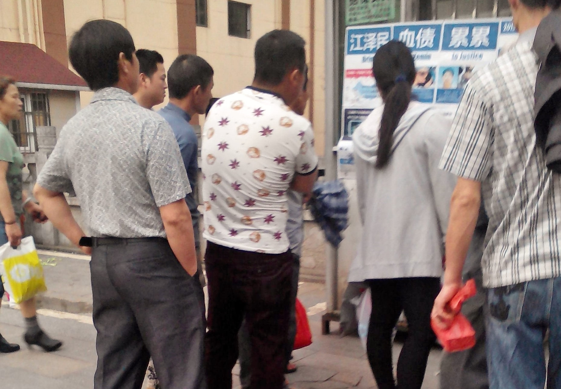 为庆祝五一三世界法轮大法日,丹东地区法轮功学员在大街小巷张贴真相展板和粘贴,将法轮功洪传世界和法轮功学员控告江泽民的信息传递给当地百姓。真相展板吸引路人观看。