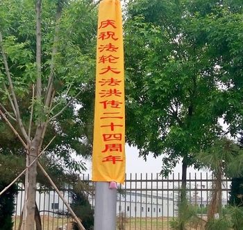 山东省烟台市喜见庆祝世界法轮大法日条幅和不干胶