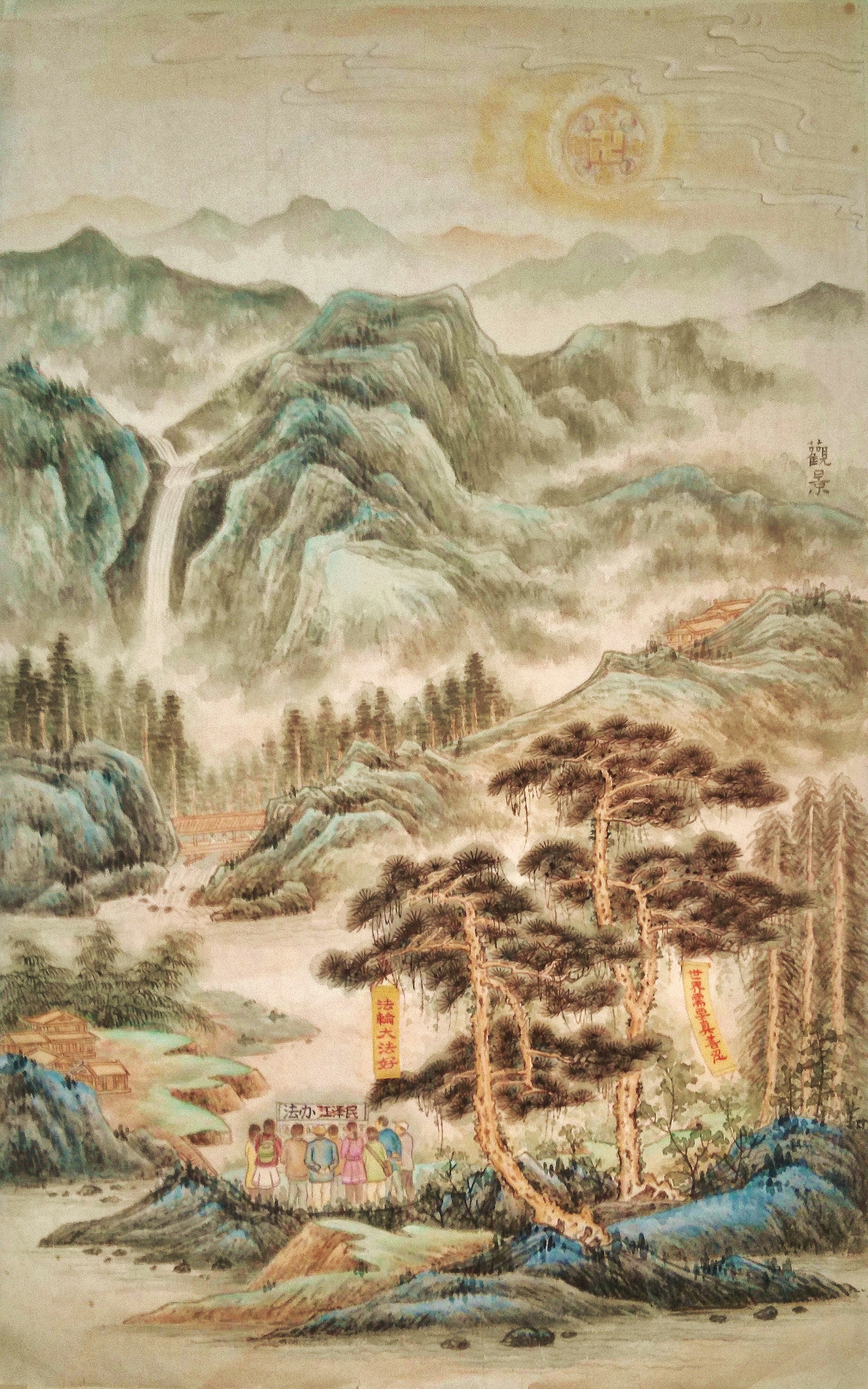 说明:峻岭绿树间,上山观景的人们在观看法轮功学员张贴的“法办江泽民”的真相展板。