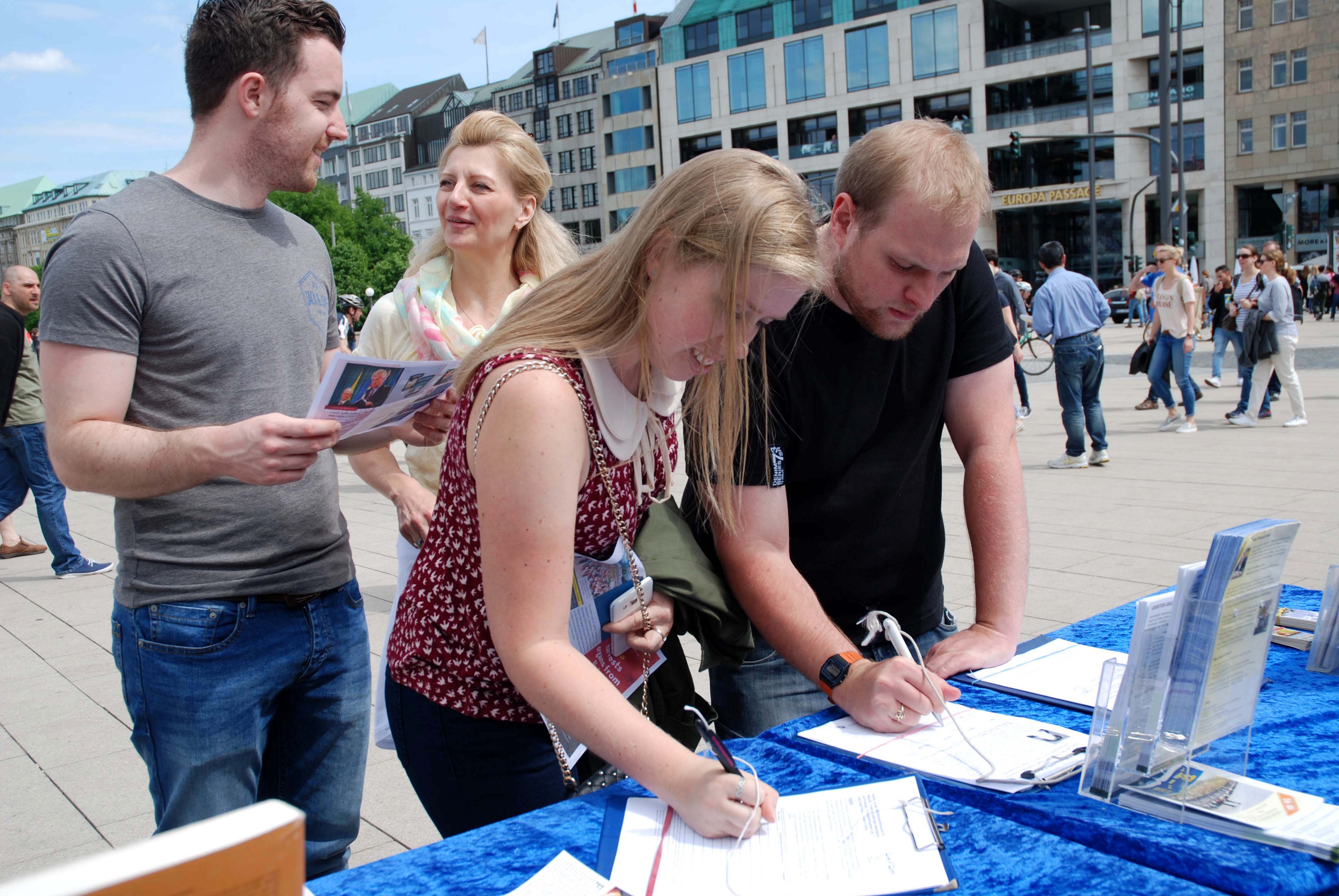 ![]() 一对来自英国,在汉堡工作的年轻人Jack 和Amily在呼吁立即释放被非法关押的法轮功学员叶菊兰征签表上签了名。 |