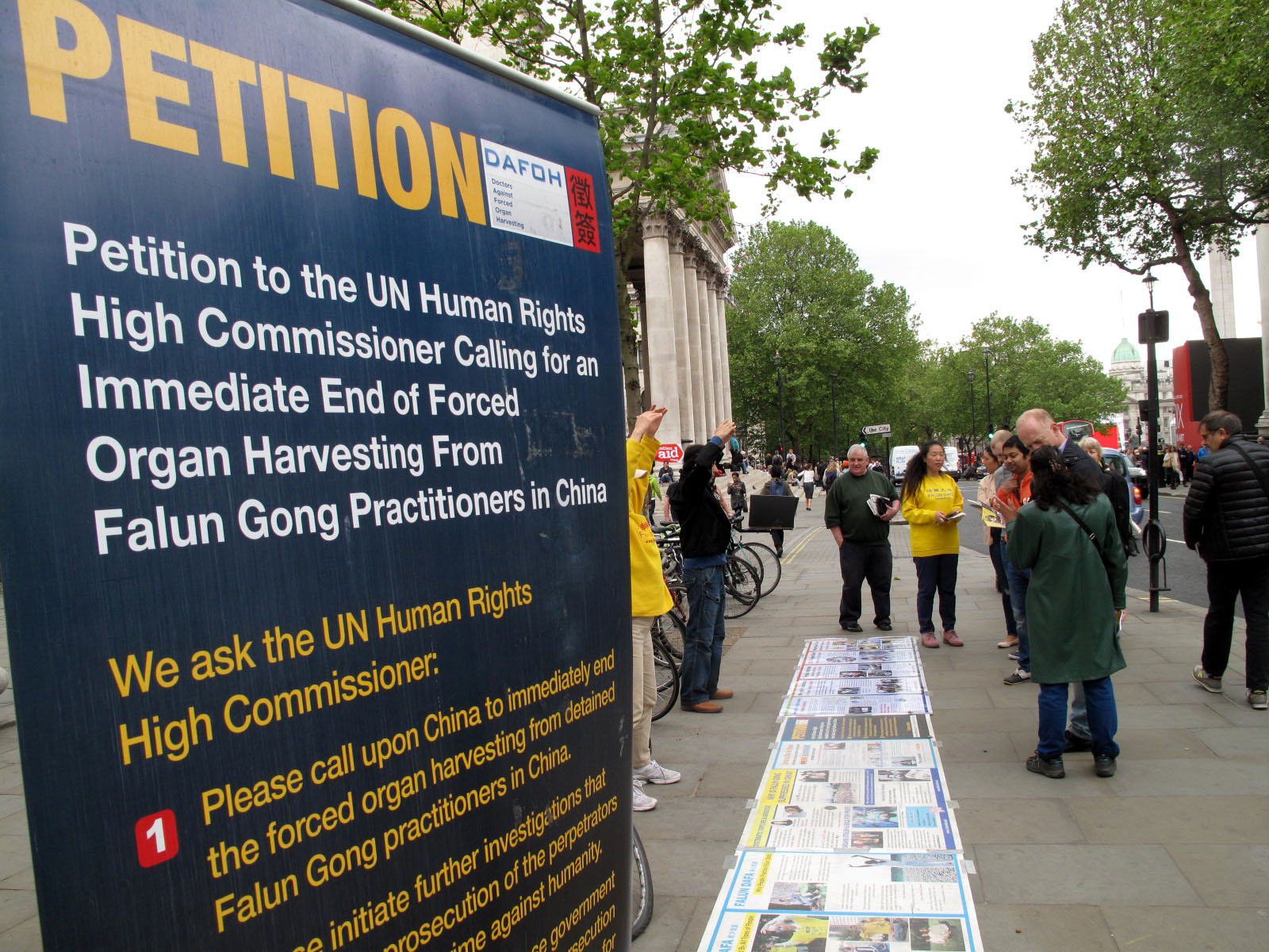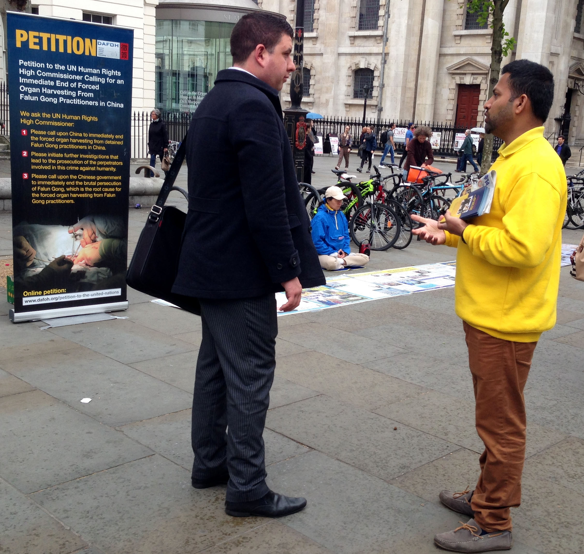 麦考义先生说,几个月前他在大英博物馆门前遇到在那里发真相资料的法轮功学员,接到一份传单,那是他第一次看到详细揭露中共迫害法轮功、特别是中共活摘法轮功学员器官罪行的资料,他感到震惊,认为“这样的迫害让人难以相信”。老人看着正在伴着祥和音乐打坐的法轮功学员,表示无法将中共的残酷迫害与眼前平和的修炼人联系起来。