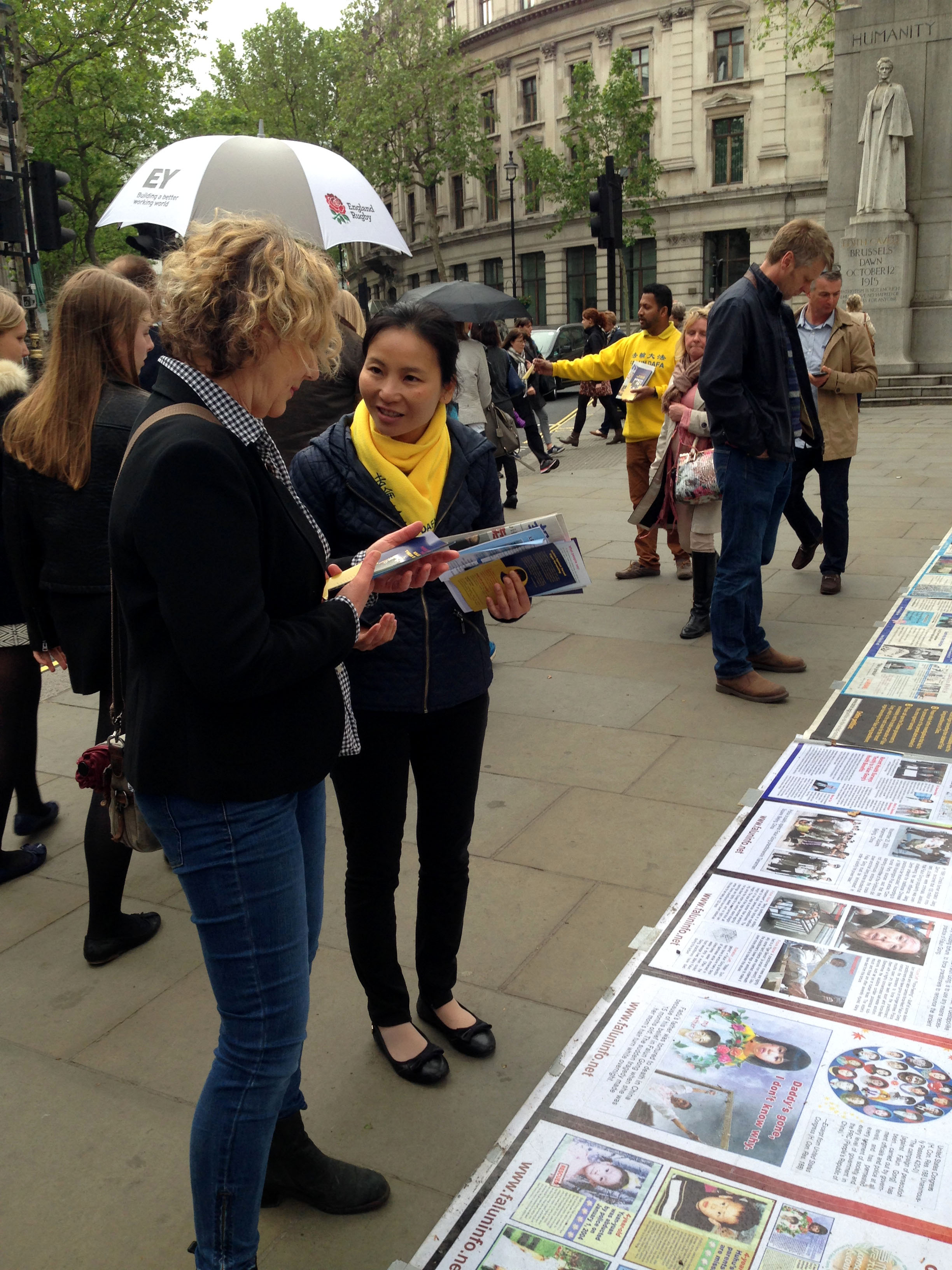 威尔士退休医生比迪(Pitt)女士周六这天来伦敦办事,路过圣马丁广场时遇到正在开展讲真相活动的法轮功学员,反活摘征签的展板吸引了她的目光。