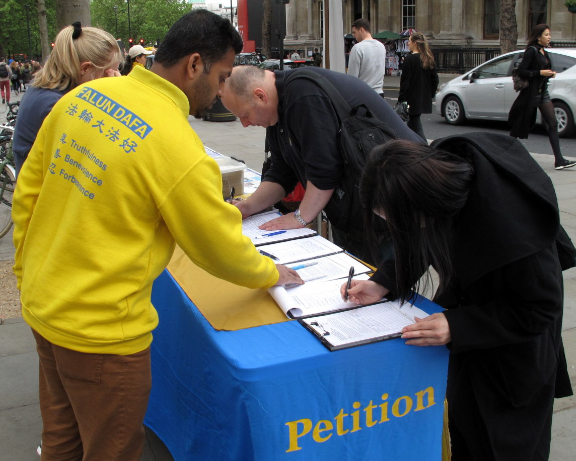 ![]() 图3:硬件工程师菲利普和女儿在伦敦圣马丁广场签名支持法轮功反迫害 |