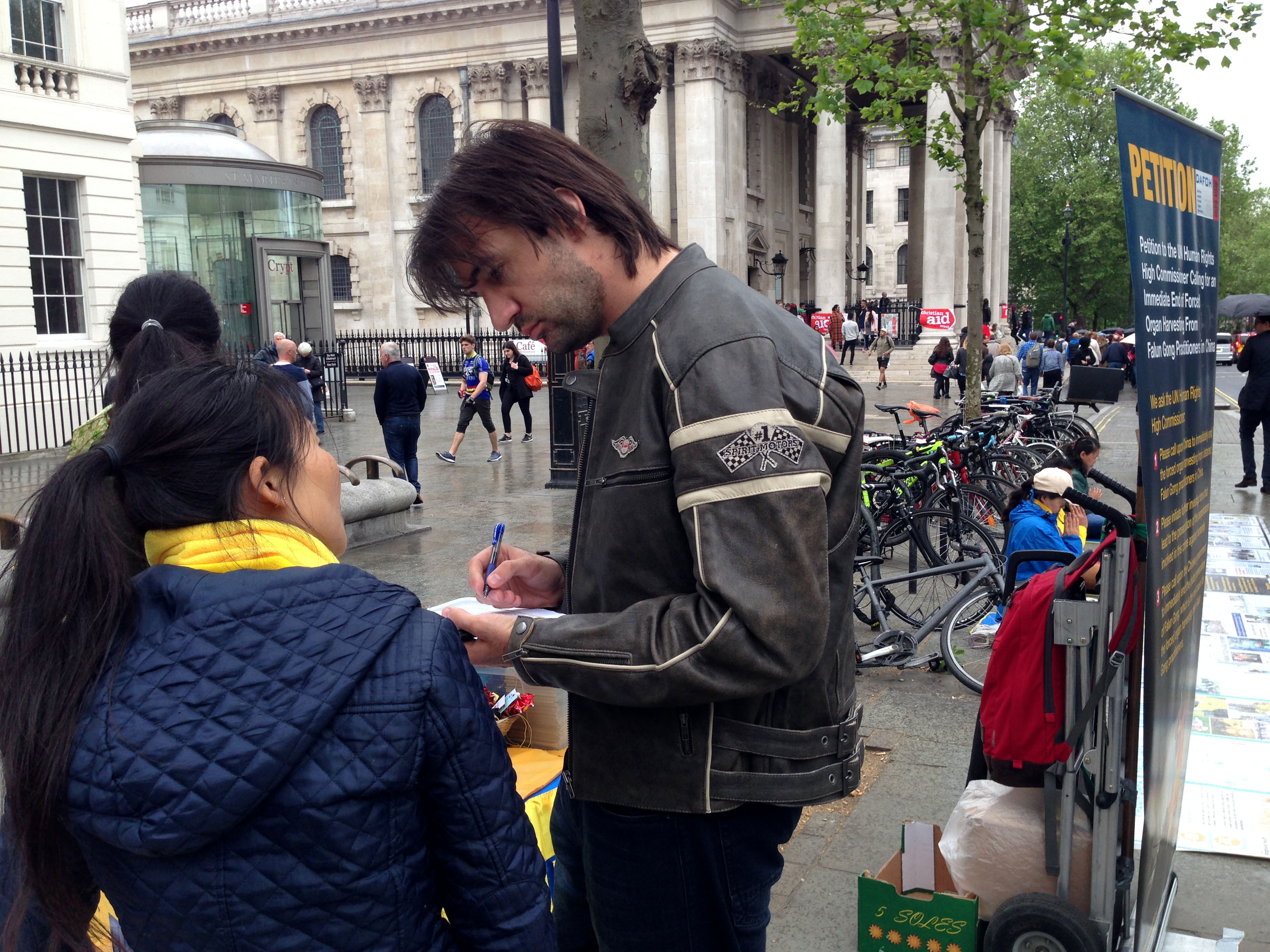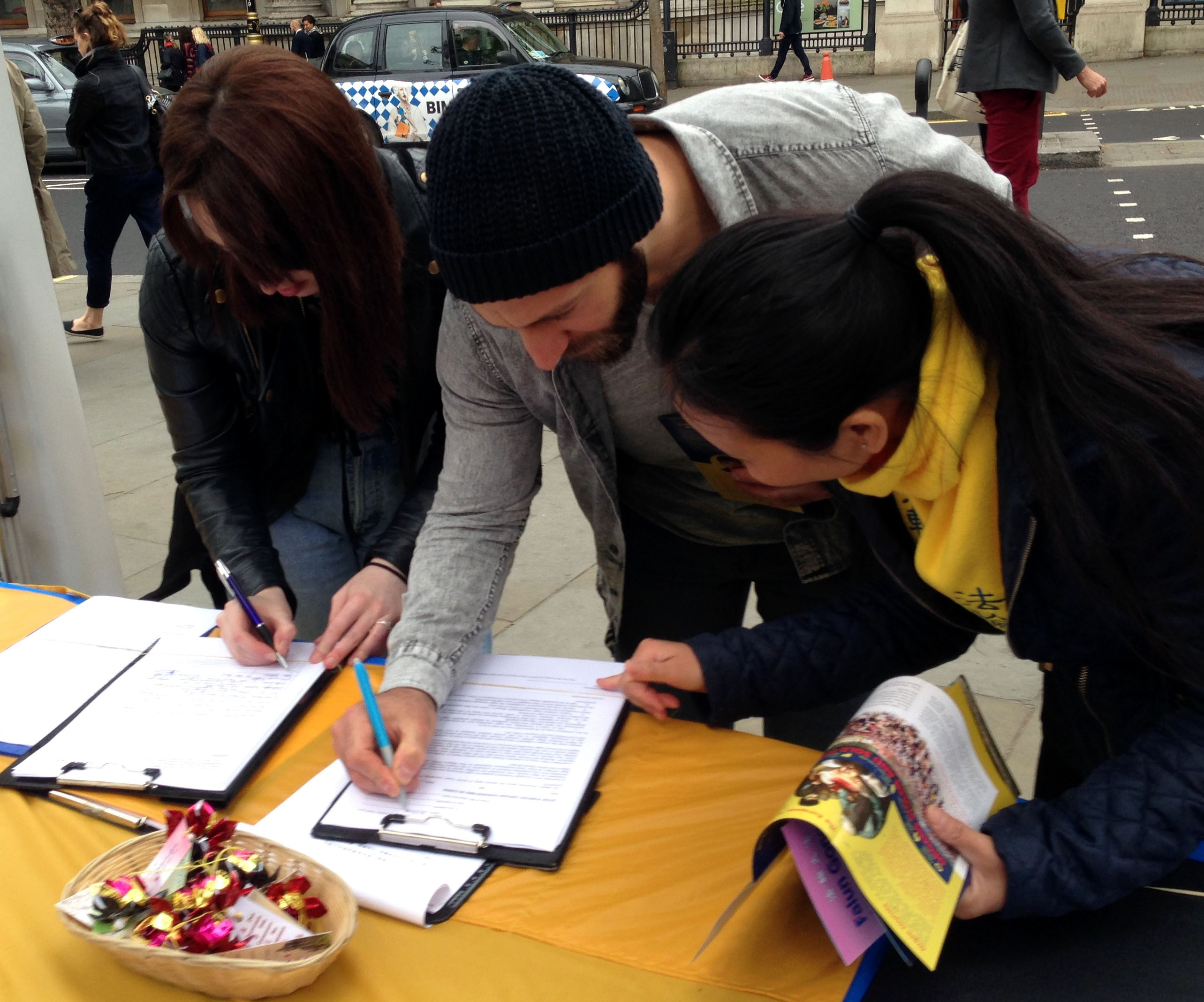 ![]() 图5:伦敦人丹(Dan)向法轮功学员深入了解真相并签名支持法轮功反迫害 |