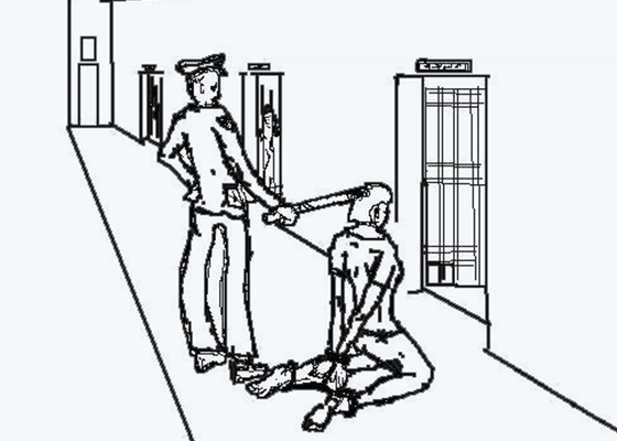 ![]() 中共酷刑示意图:“穿后刑”——将人双手背铐、双膝下跪、双脚戴脚镣,同时将手铐、脚镣用铁丝最短距离串起来 |