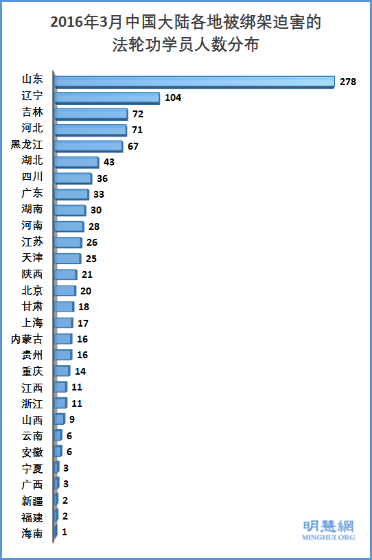 迫害最严重的省份依次为:山东,二百七十八人,辽宁,一百零四人,吉林,七十二人,河北,七十一人,黑龙江,六十七人,湖北,四十三人,四川,三十六人,广东,三十三人,湖南,三十人,河南,二十八人。