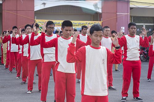 ![]() 图1-9:“国家皇冠学院”一百五十名师生集体学炼法轮功。 |