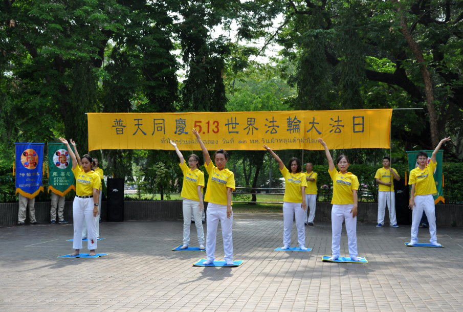 活动前一天,曼谷下了一场久违的大雨,扫除了连日的炎热,五月一日一早,仑皮尼公园炼功点上,阵阵微风徐徐而来,空气清新、凉爽,法轮功学员身着黄色鲜艳的“法轮大法好”T恤、白色长裤,在夏日如春的青青草坪上,炼完了舒展、优美的五套功法,发完正念后,来到了炼功点附近的露天舞台。