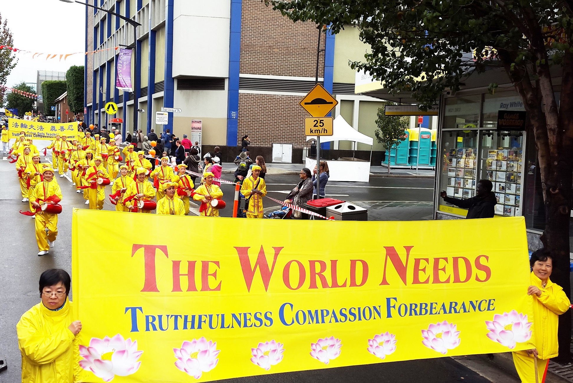 法轮功学员的方阵是在为游行队伍开道的澳洲骑兵队之后,他们威武雄壮、多姿多彩,在这个拥有七十多个社区团体参加的年度文化节游行中备受各界瞩目。法轮功游行队伍由天国乐团、腰鼓队、大型花车和彩旗队组成。每个队阵以不同的服饰和表现形式呈现了中华民族优美的传统文化,赢得在场观众的热烈欢迎和掌声。