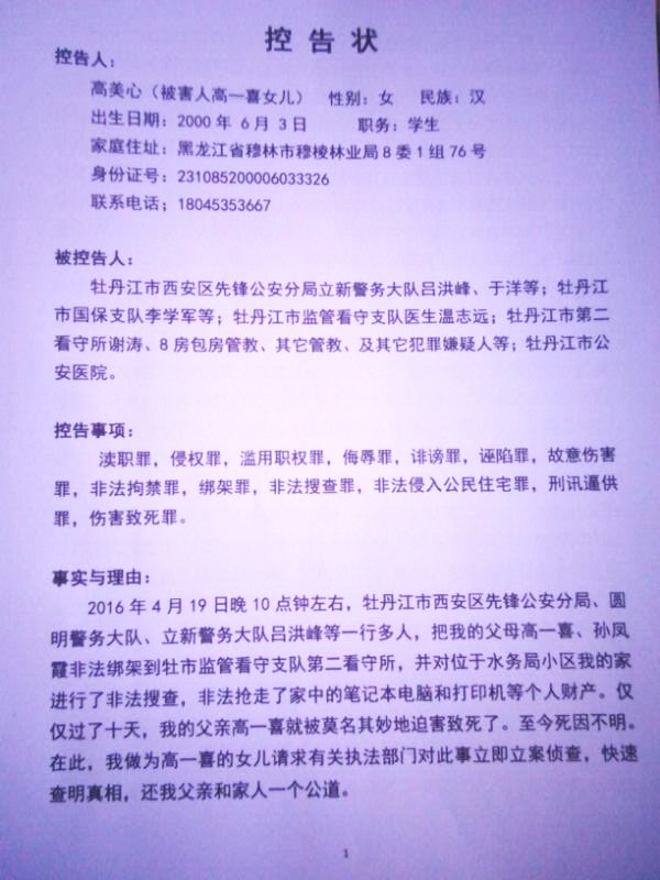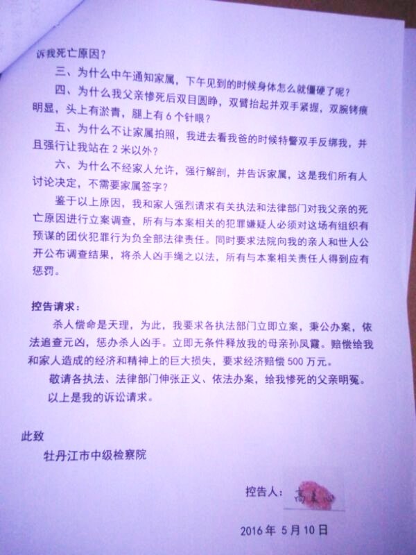 为了给冤死的父亲讨回公道,高一喜十六岁的还在上高一的女儿决定到相关部门控告。五月十八日,孩子先来到牡丹江市中级检察院,递交对高一喜被迫害致死案相关责任人员的控告状,但工作人员以没有尸检结果为由不予以立案。家属又到了牡丹江中级法院,工作人员说她们受理不了这个案子,让家属去牡丹江西安法院立案。而来到牡丹江西安区法院,法院接着推脱说这是大案,得找牡丹江西安区检察院。于是孩子又来到西安区检察院,那里的工作人员却让孩子向抓捕被害人高一喜的先锋分局要立案通知书和拘留证。因为先锋分局拒绝提供,孩子为父申冤却求告无门。