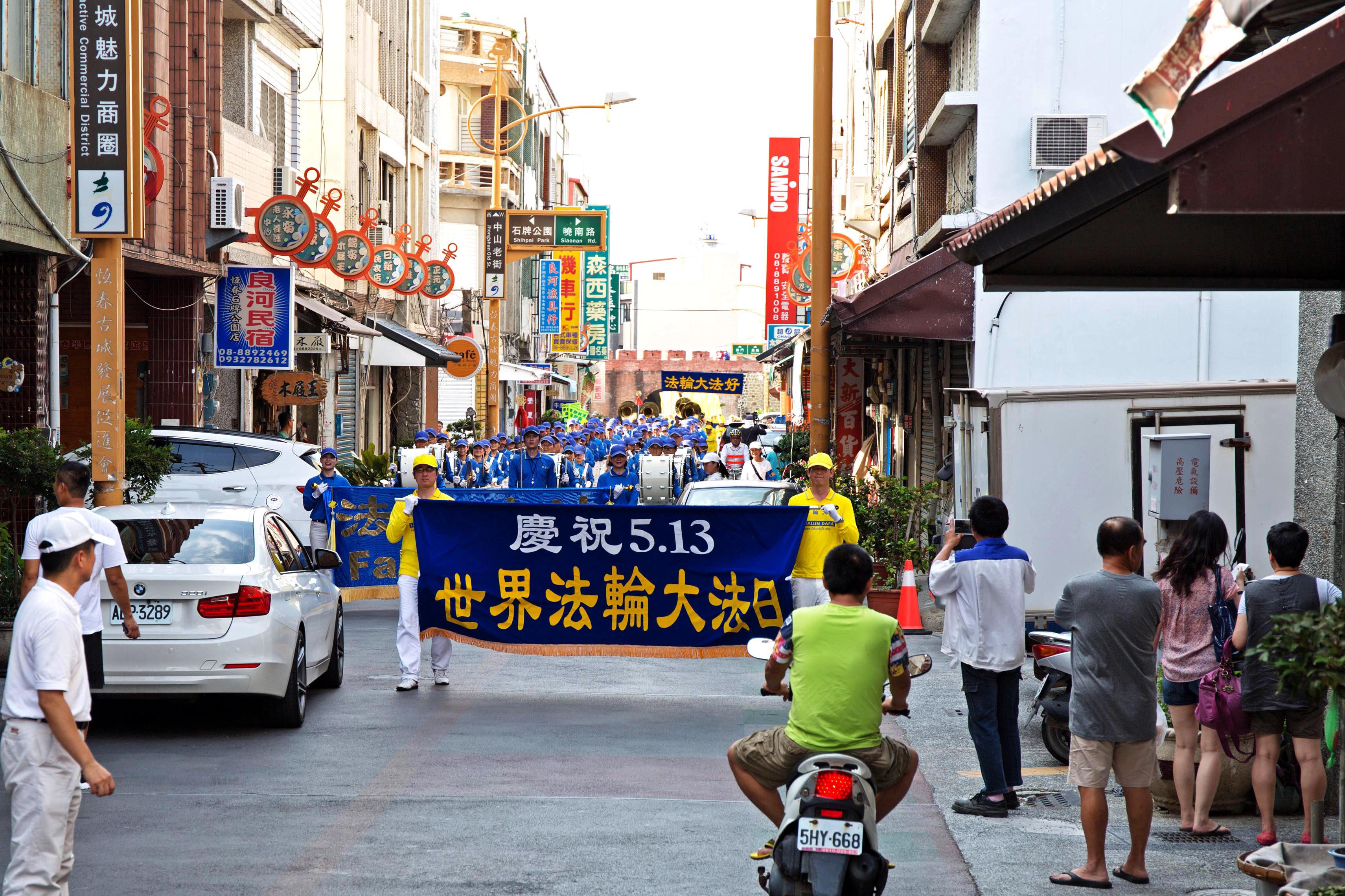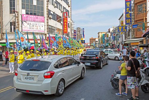 恒春古城游行由阵容庞大的天国乐团前导,美丽的仙女队手捧大莲花降凡献瑞,学员们精神抖擞举着旗帜和横幅,上面写着:“庆祝世界法轮大法日”、“法轮大法好”、“真、善、忍”等,炼功队伍展示祥和五套功法,喜气十足活泼亲切的腰鼓队压轴,形成恒春老街一条美丽的风景线,吸引许多店家和游客观看、拍照。这美好的画面所到之处都受到热烈欢迎,但在中国大陆却看不到,也让来台的大陆游客很大震惊。