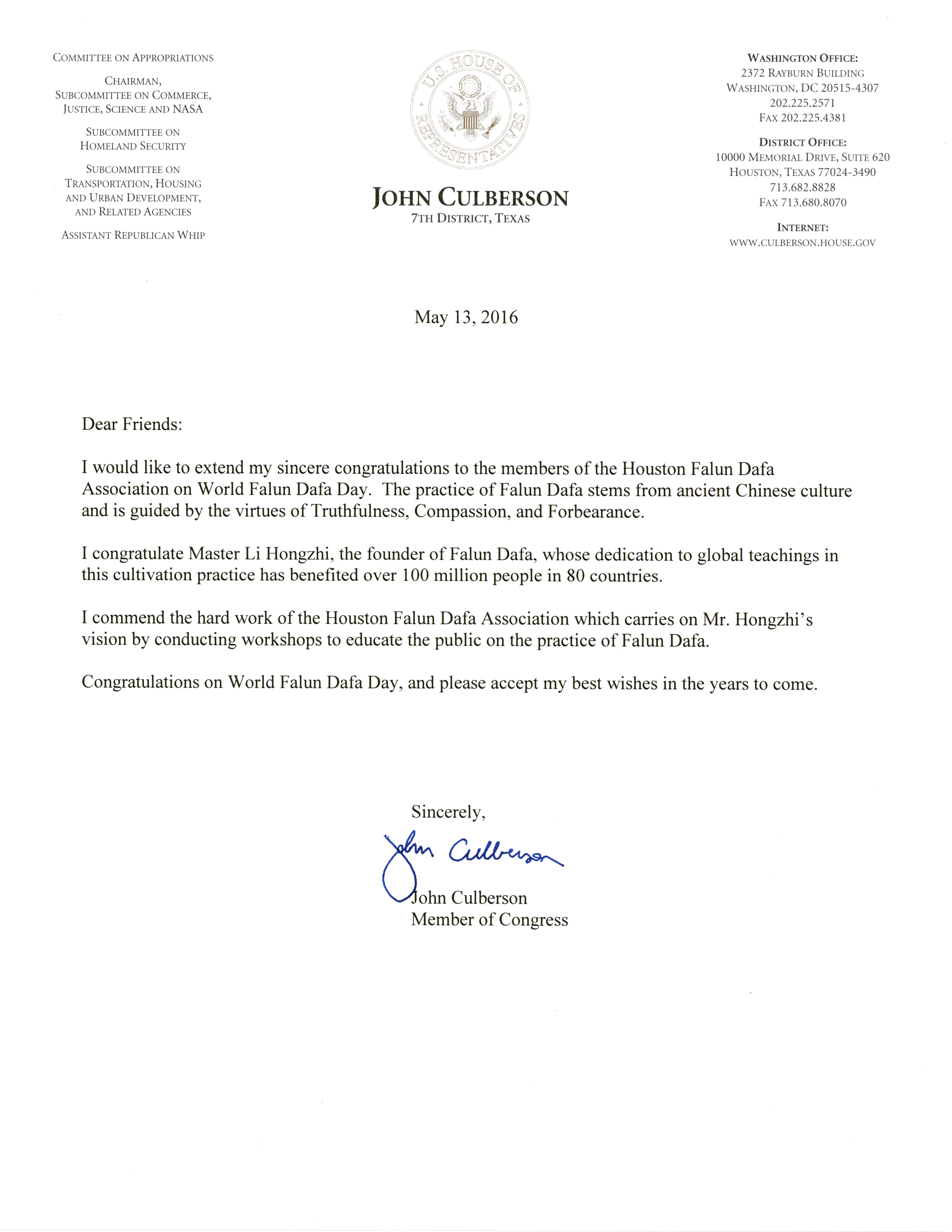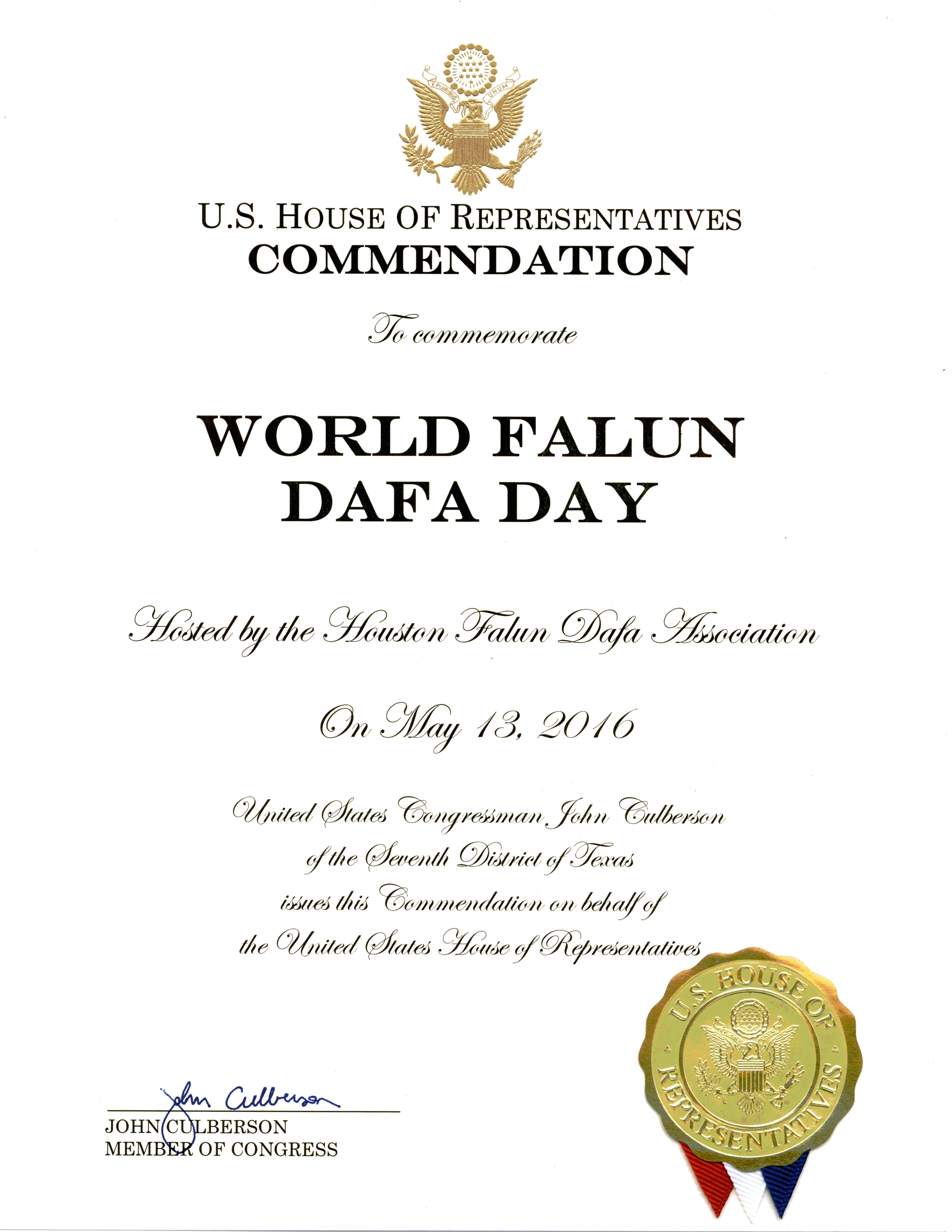 美国德州第七选区国会议员约翰·考伯逊在他的贺信中祝贺法轮大法创始人李洪志先生把大法传向世界,使得上亿人受益。他赞扬大法学会按照李洪志先生的教导给当地居民举办免费教功。他还颁发了世界法轮大法日的认证书。