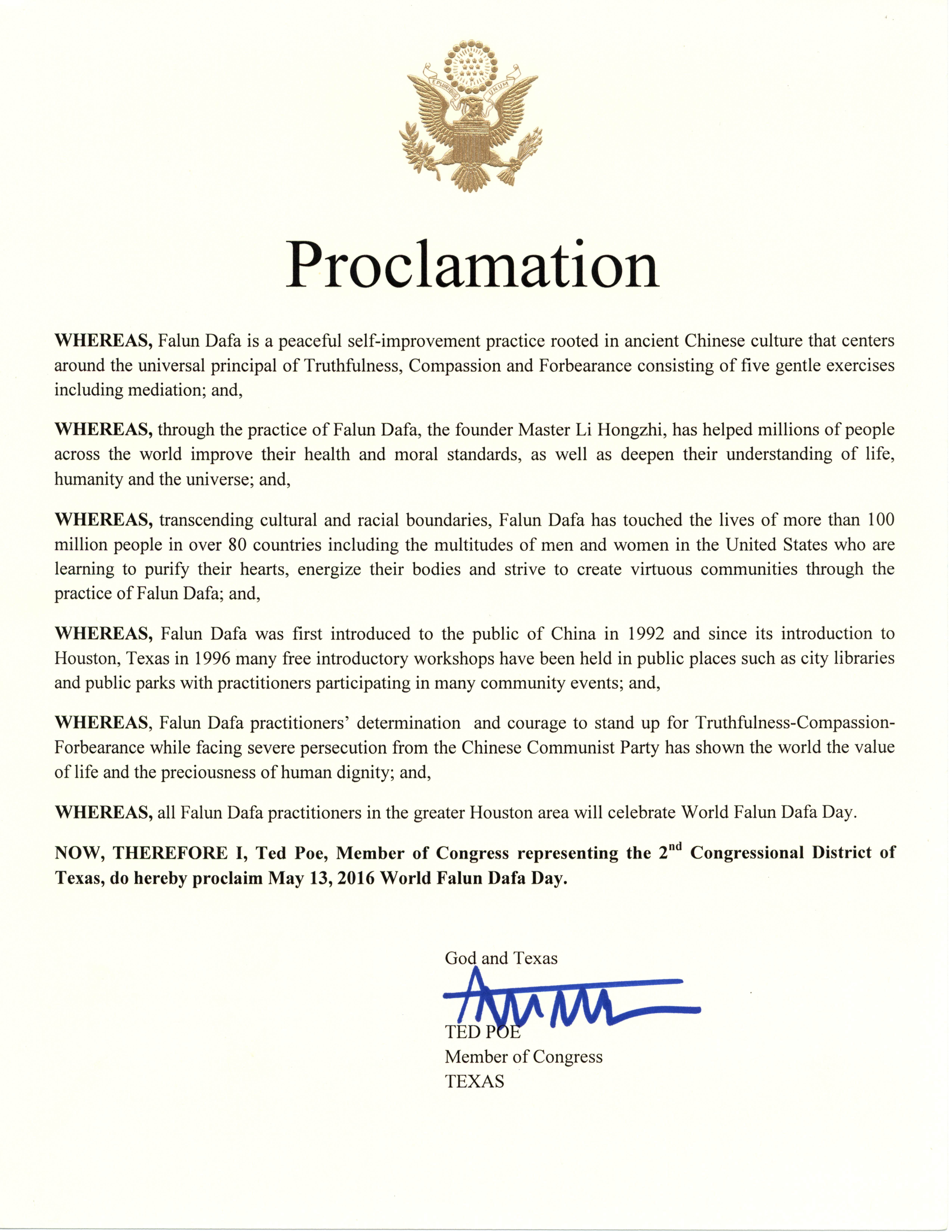 鉴此,我,泰德•鲍(Ted Poe),美国德州第二选区国会议员,宣布二零一六年五月十三日为“法轮大法日”