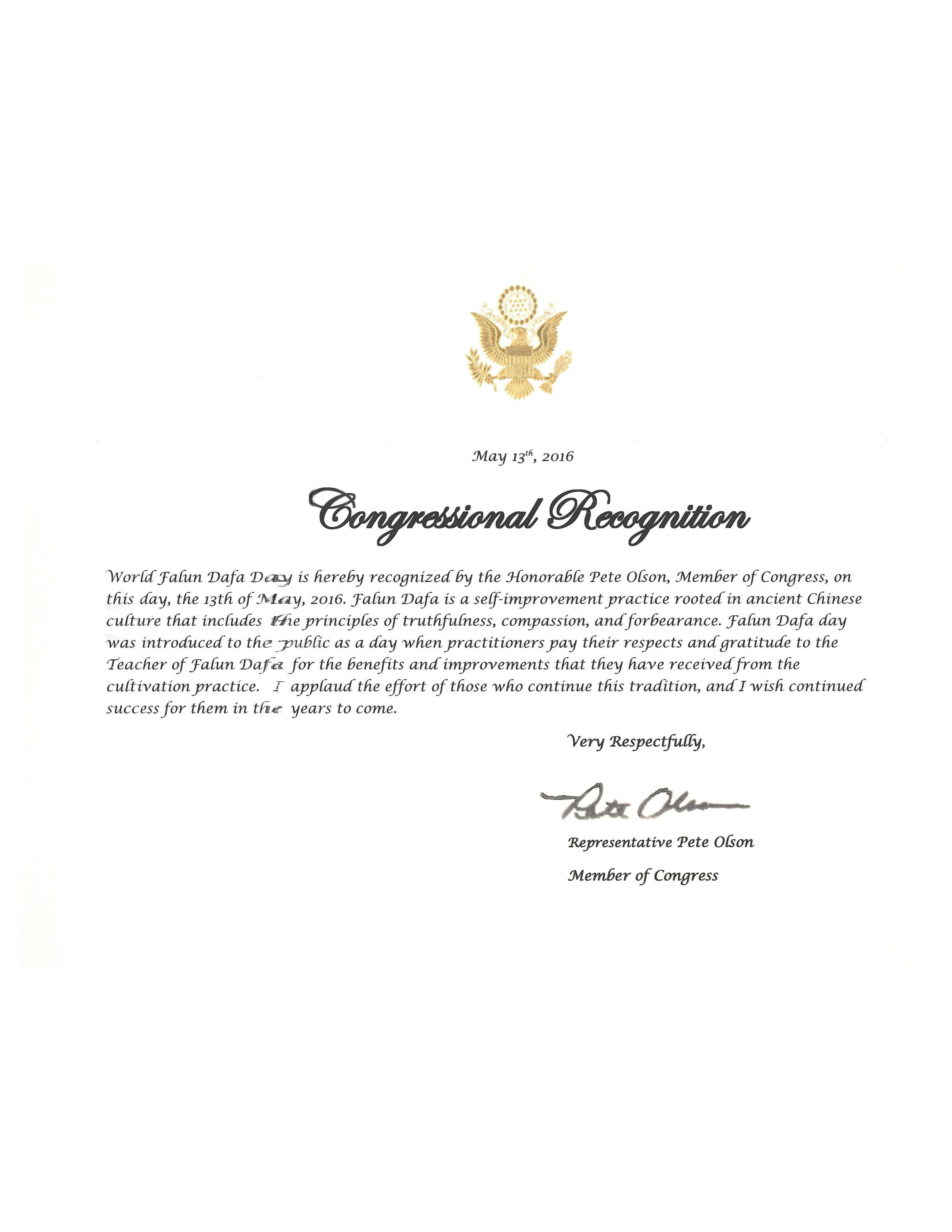 世界法轮大法日在即,美国国会议员欧森在此嘉奖这一天—— 二零一六年五月十三日。
