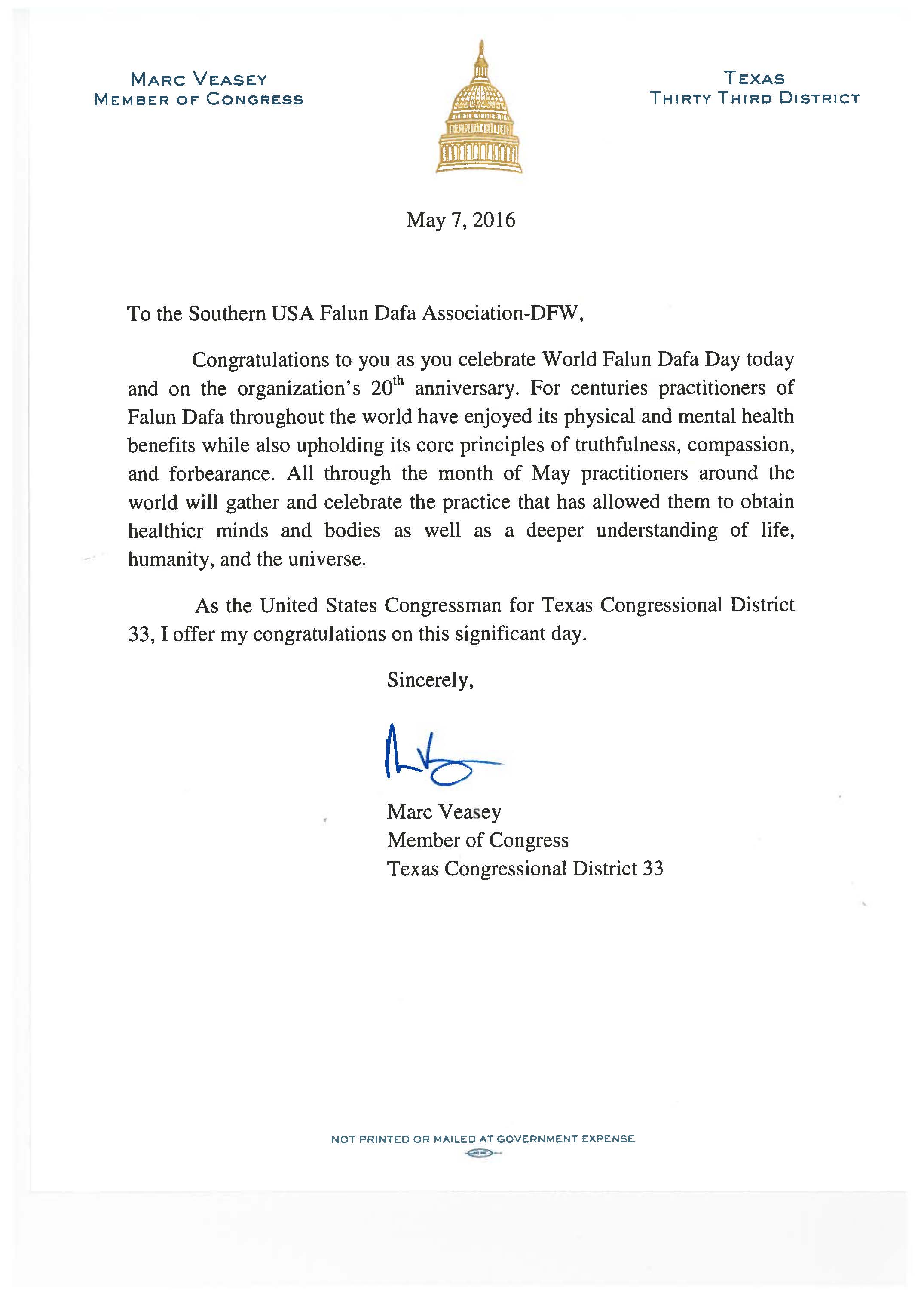 美国德州第三十三选区国会议员马克·维西的贺信及译文