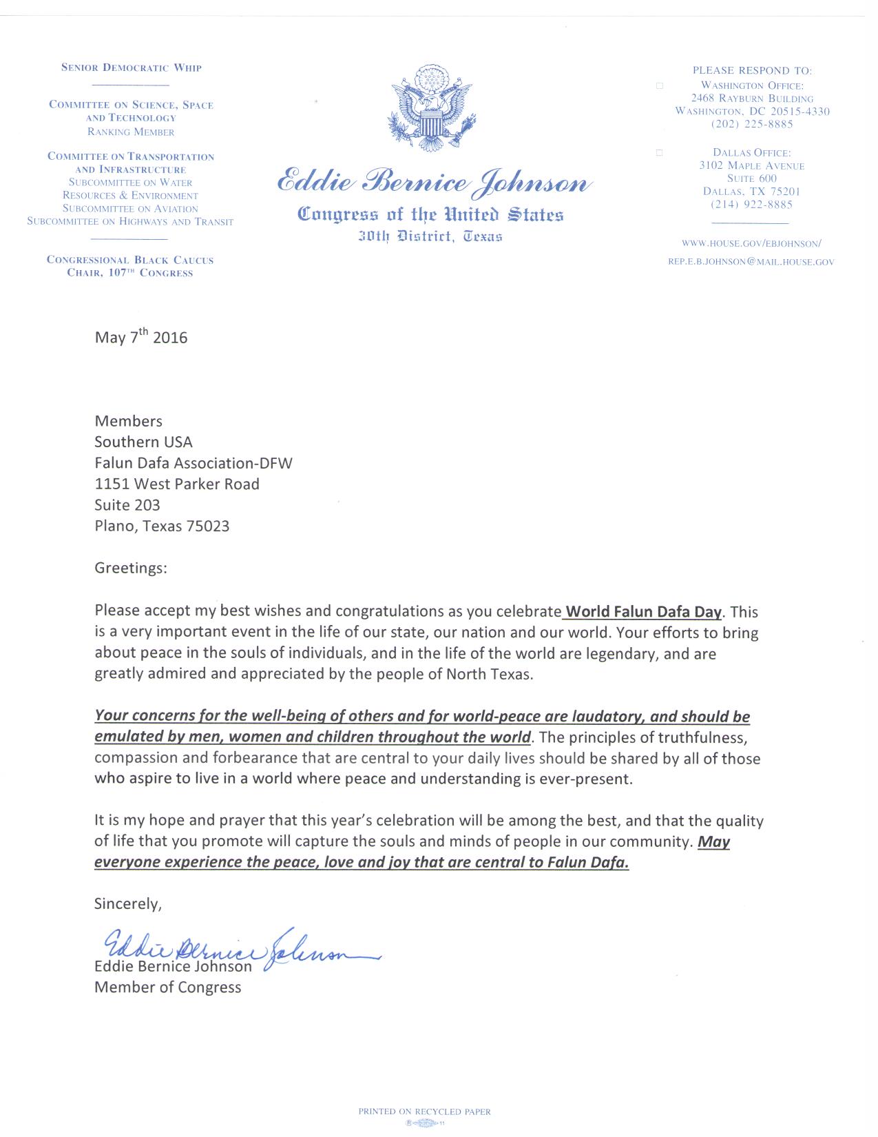 美国德州第三十选区国会女议员艾迪·伯尼斯·强生的贺信及译文: