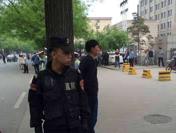有些便衣拿着手机或录像机东看西走;部分特警三两成队头戴钢盔、手持警棍与盾牌绕着法院门前巡逻,部分特警拉起长长的警戒线将围观的群众拒之数十米开外;交警佯装指挥交通,实则驱赶途经此处见状好奇而驻留观看的群众。“人民”法院的电动伸缩门收拢到尽可并行通过五人的宽度,几个警察在门口把守,不允许任何“人民”进入,甚至办理其他案件跑程序的律师也被阻挡在外。