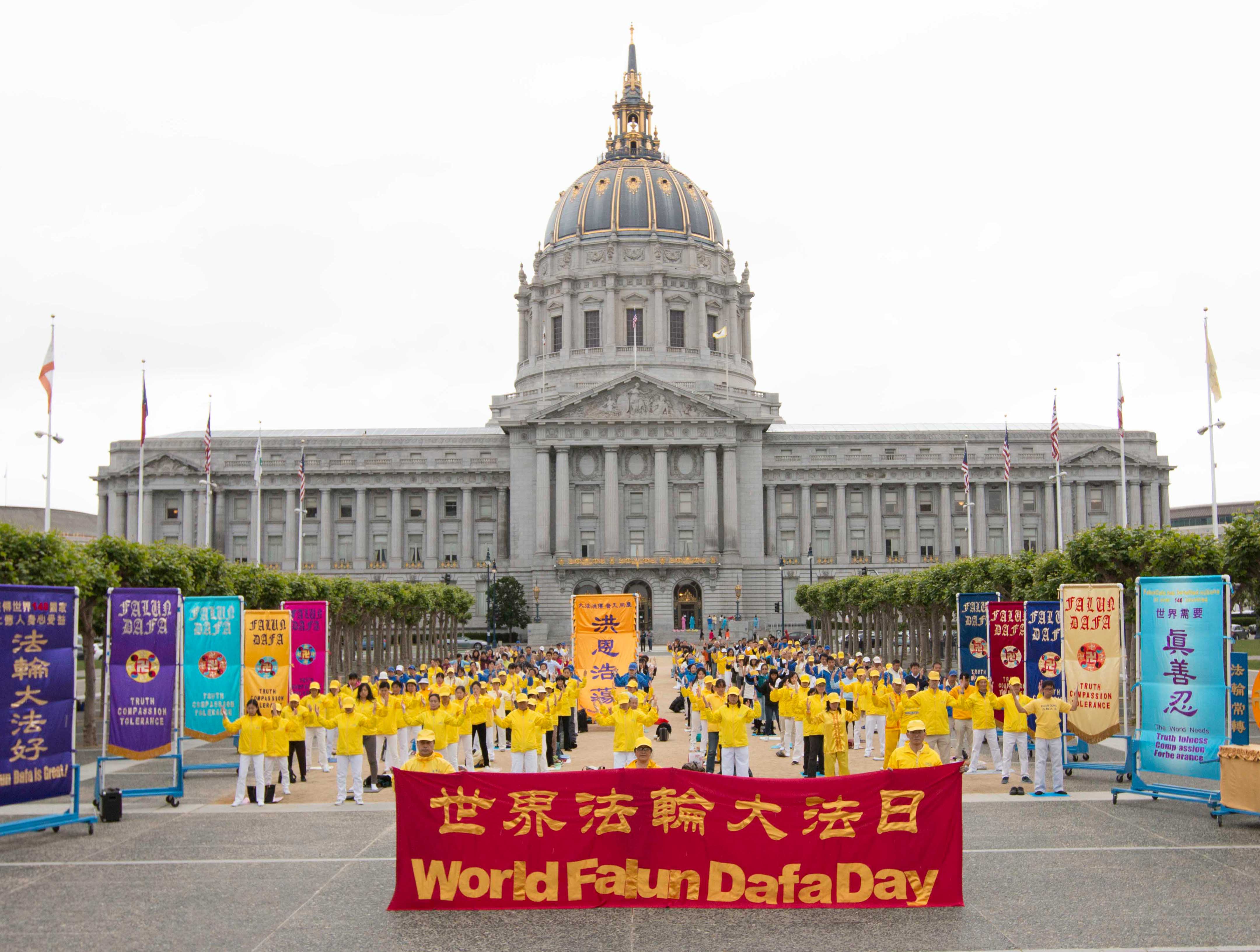星期六上午八点五十五分,法轮功学员首先在旧金山市政厅广场集体炼功,展示祥和优美的功法,许多游客被吸引,还有的人跟着学练。有的拿起相机拍摄下这殊胜的画面。