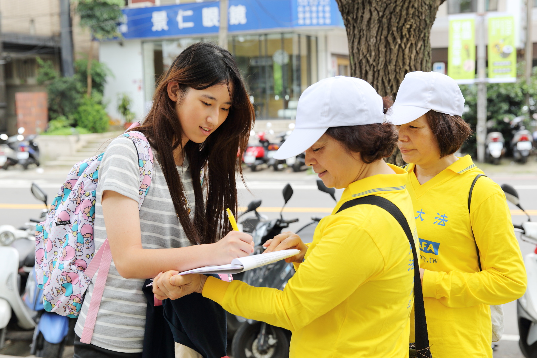 一位路过的学生,在面对学员邀请他征签支持诉江时,想要了解什么是法轮功,足足问了超过半小时的问题,当知道法轮功在大陆遭受残酷对待,就慨然签下名字,表示支持诉江。