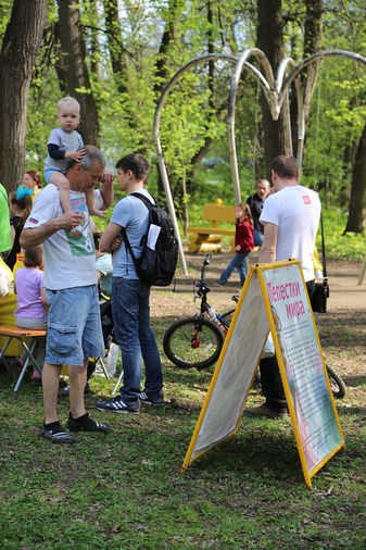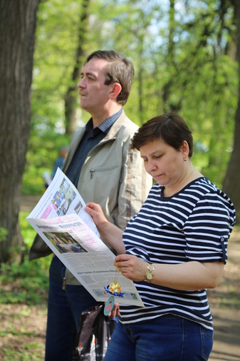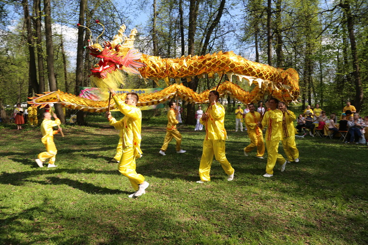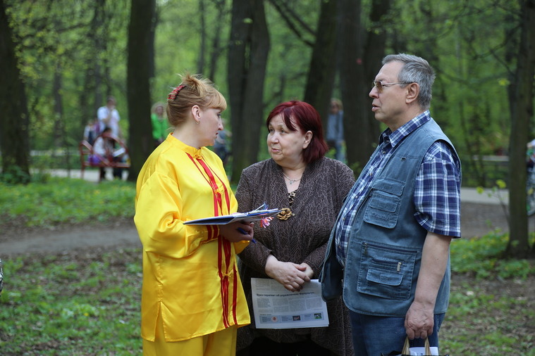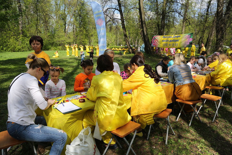 【明慧网二零一六年五月九日】二零一六年五月七日下午,阳光明媚,莫斯科南面的库斯明克公园里喜气洋洋,法轮功学员正和民众共同庆祝“5.13世界法轮大法日”。