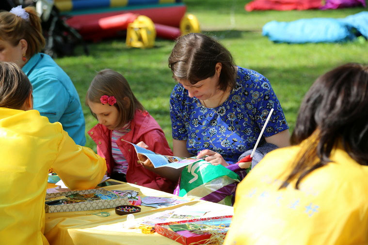 图10:莫斯科库斯明克公园里欢庆法轮大法日的活动中,小朋友学叠纸莲花