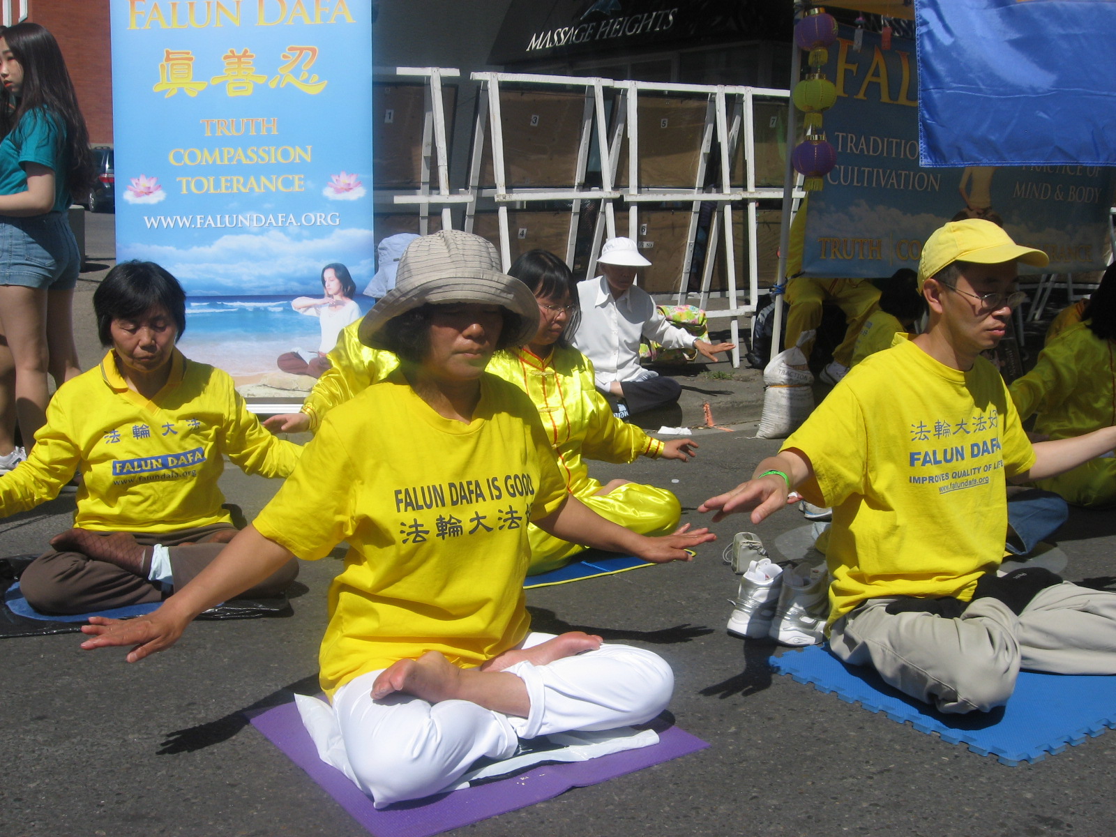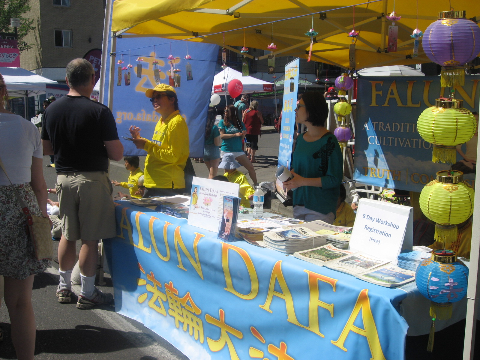 在众多游客中,许多华人主动来和法轮功学员打招呼。一对两天前才从大陆来的老年夫妇拿走了展位上所有的真相杂志,他们微笑着听法轮功学员介绍中国目前的形势,当大法学员说江泽民因迫害法轮功,现在情况不妙时,他们连连点头,表示赞同。华人凯润和先生一直沿街张望路边的展位,想找到法轮功的展位,因为她认识一位法轮功的朋友,想和她打招呼,当她终于见到自己的朋友时,她非常开心。