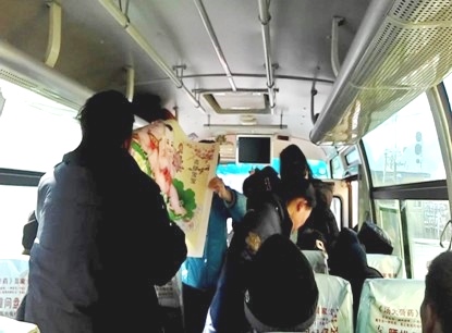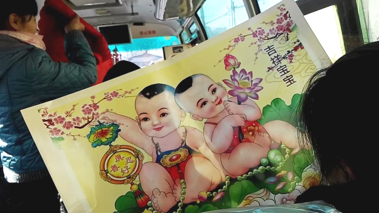 我和同修结伴来到停下的大客车上,面带微笑的和大家打招呼:“大家好,年货都买好了,等着回家呀?”大家说:“是啊。”我说:“给大家送福、送年画,大家把福也带回家。开开心心过大年好吗?”大家说:“好!”我说:“您看这画漂亮不?这画上面有‘真、善、忍好’,回家贴在墙上,时时按照他去做,就会家庭和睦,五谷丰登;大家再看这福字上有‘法轮大法好’,大家回去诚心敬念就会身体健康、远离灾祸。”他们都笑着举着手要!我说:“好,现在就发给大家,每人一张。”