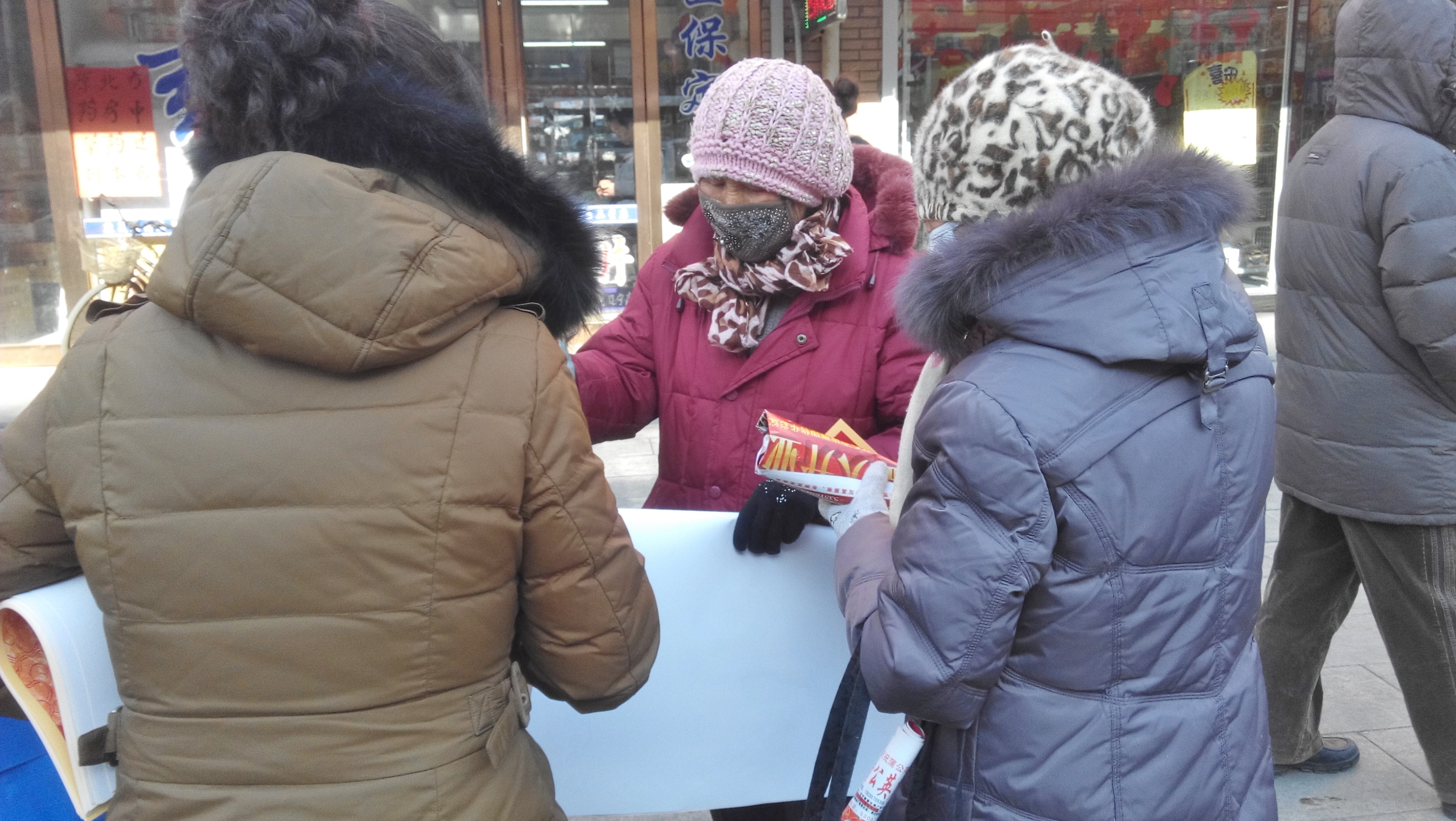赶大集时,我们带着明慧年画,展开后,对大家说:“大家好,免费赠送年画了。”有的问:“是法轮功的不?”我说“是!”他们就都过来抢着要。有的说:“是法轮功的我就要,别的我不要。”有的还要给我们钱,基本上都是拿了年画,又做了三:退.。来不及退的,我们就大声的告诉他们,“一定要记住法轮大法好!”有的还激动的对我们说:“今天有零下三十多度呢,你们不冷吗?我请你们吃点饭吧!”有的说:“这么冷的天,别冻着了。”有的还帮我们戴好帽子、整理整理衣服,有的双手合十鞠躬谢我们。我们说:“您不用谢我们,是我们师父让我们来救你们的。”他们连忙说:“谢谢师父、谢谢师父!”