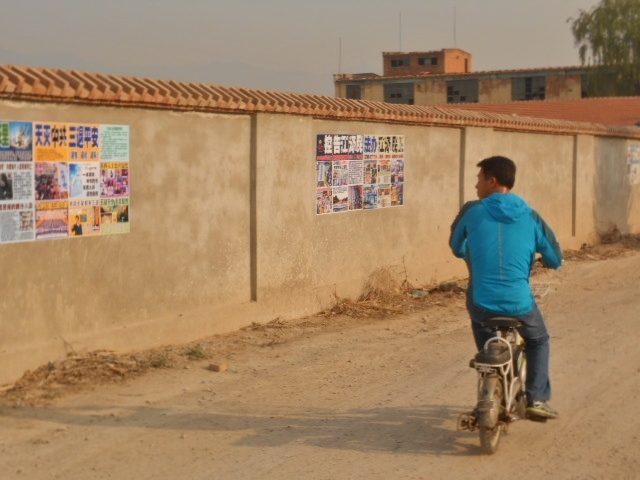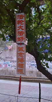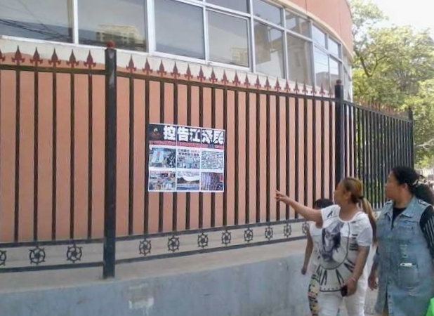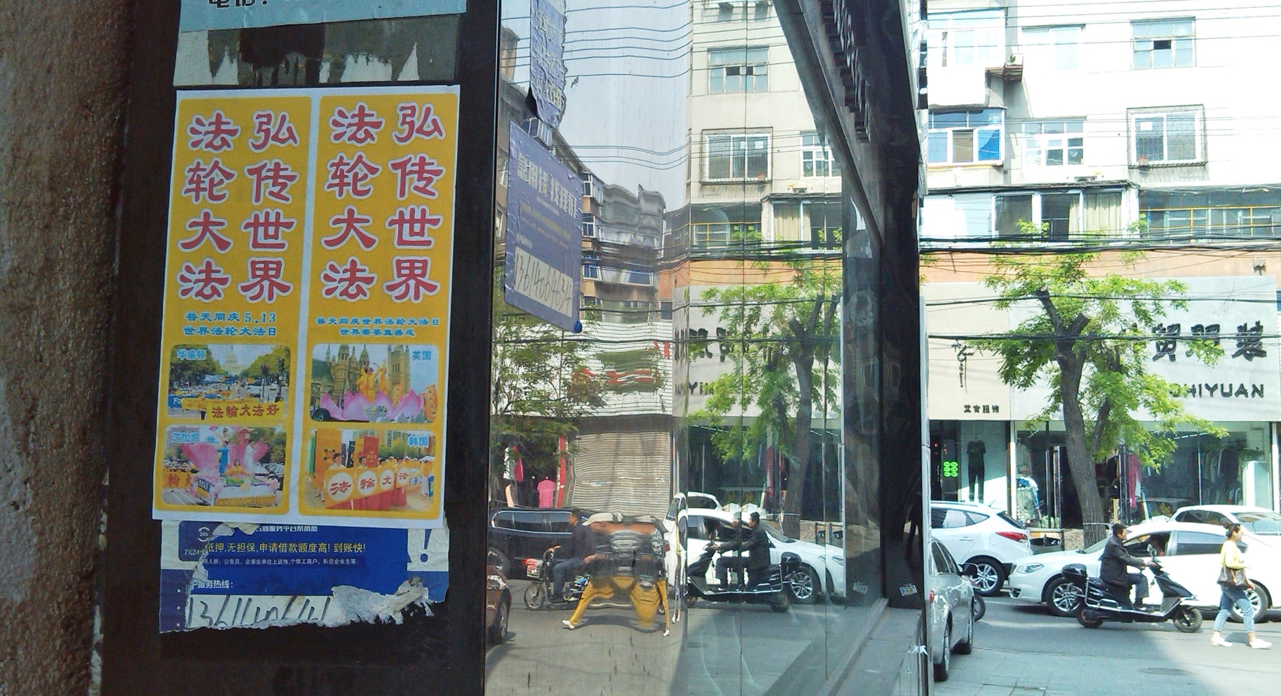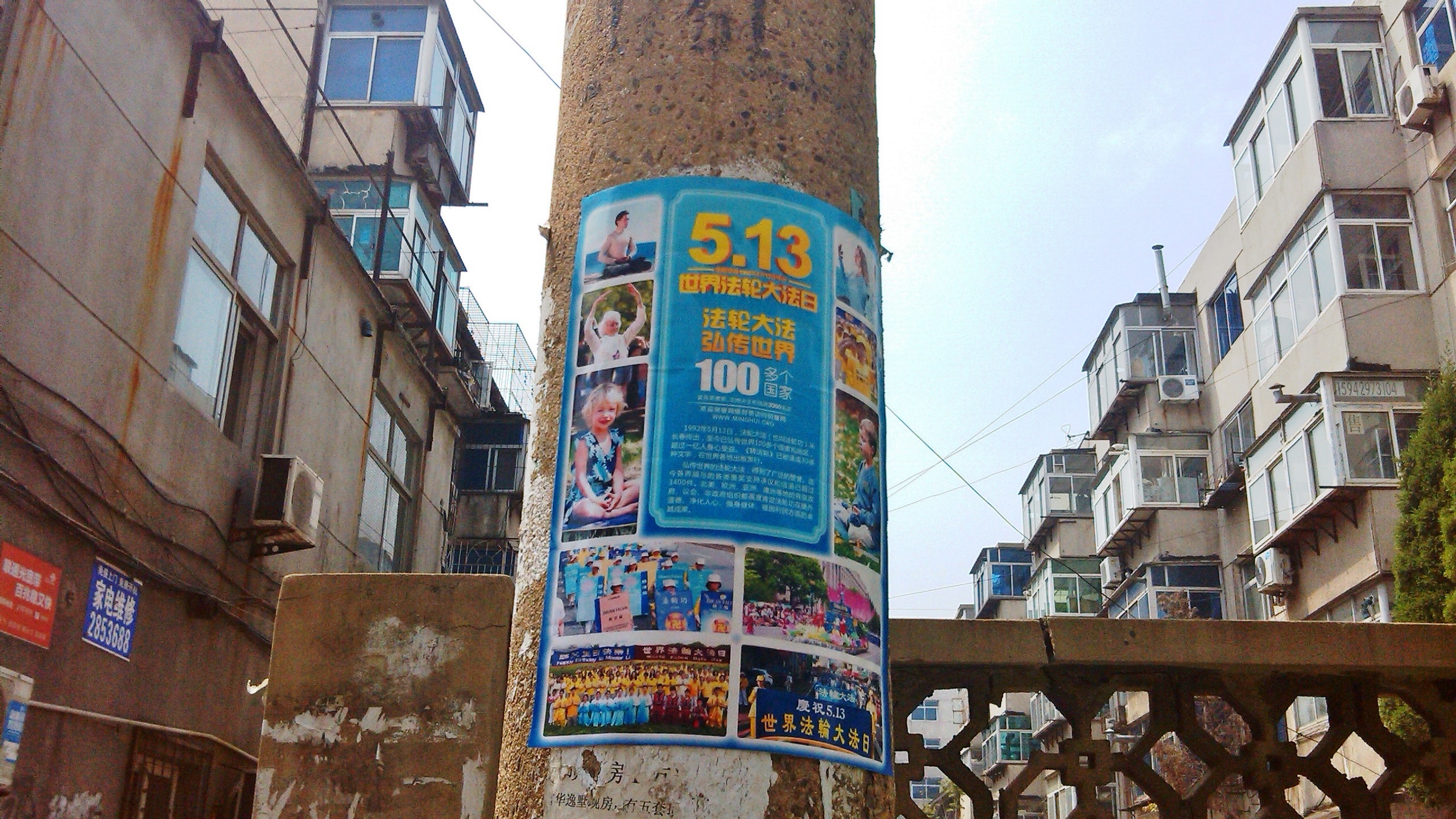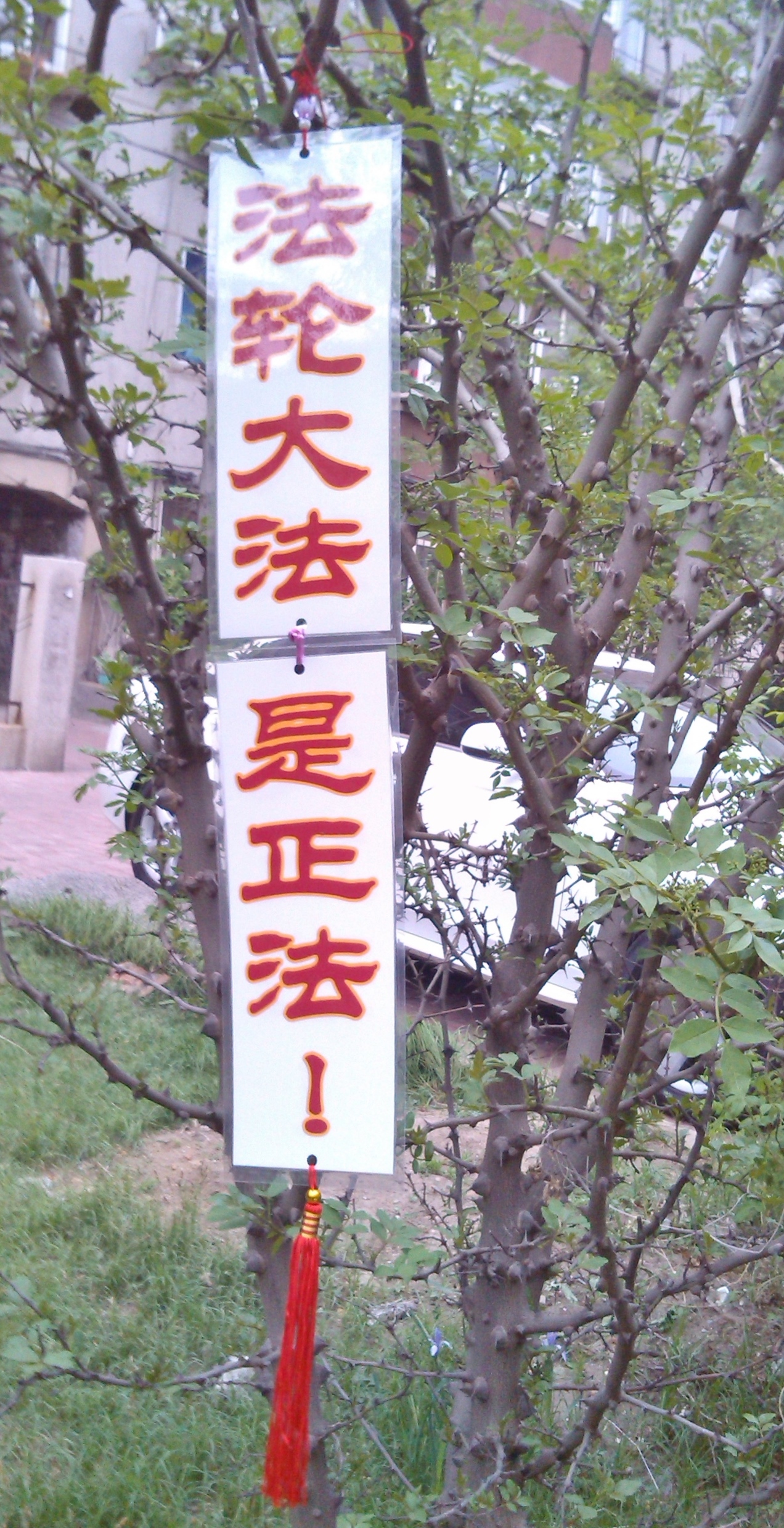 二零一六年五月,在辽宁省锦州市古塔区的大街小巷、小区内随处可见法轮功真相粘贴、树挂和展板。