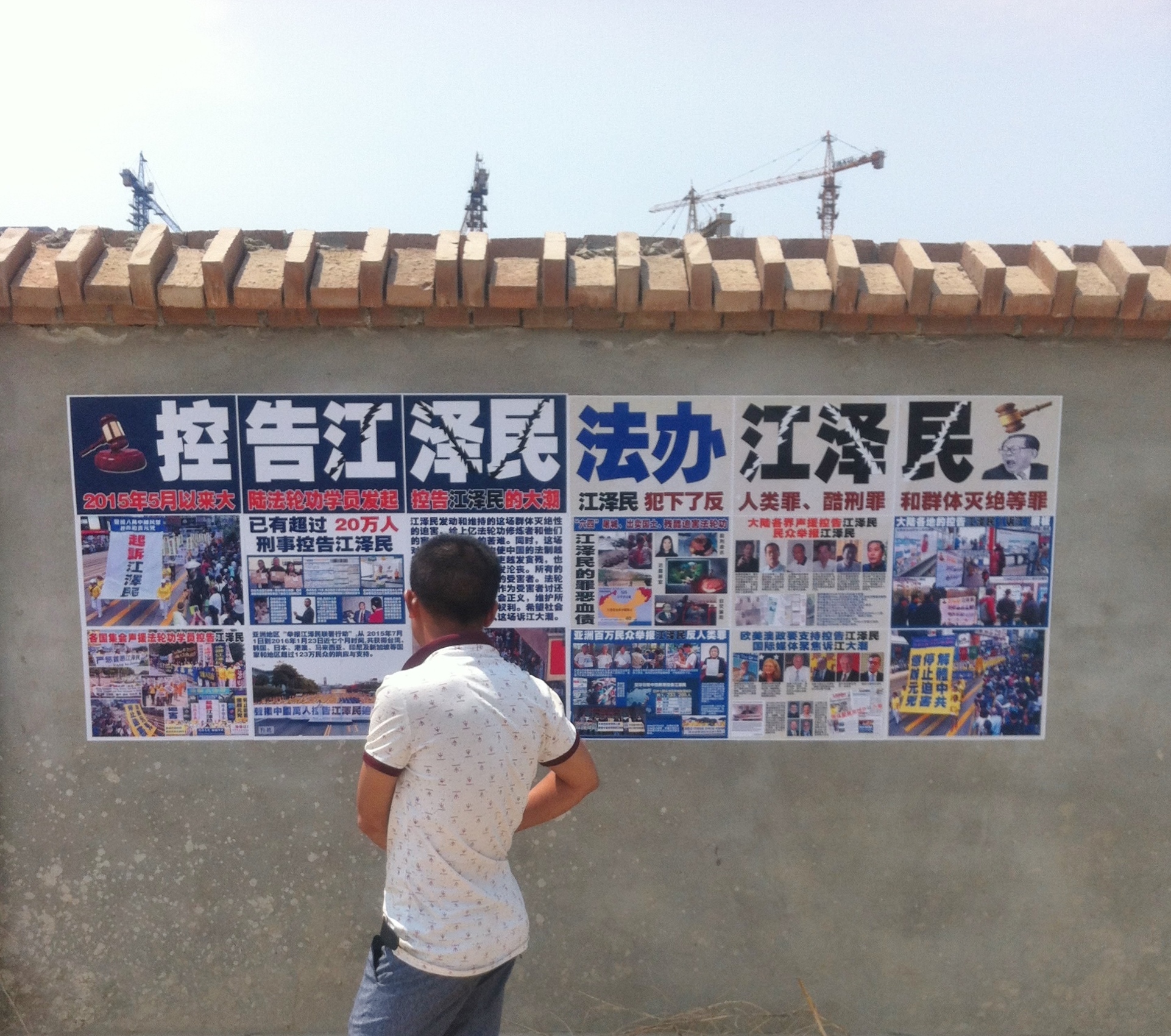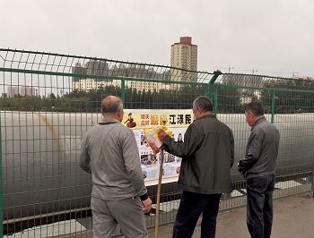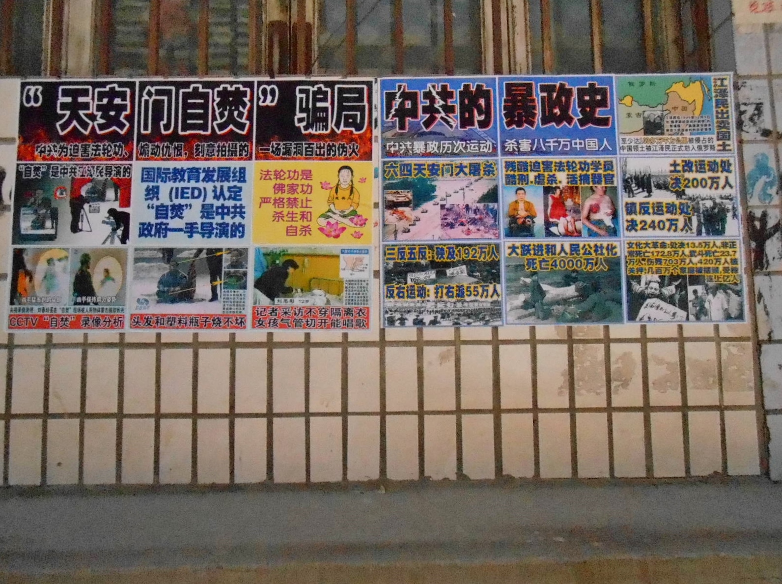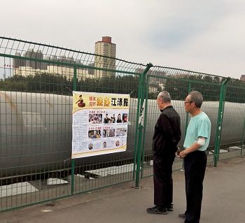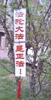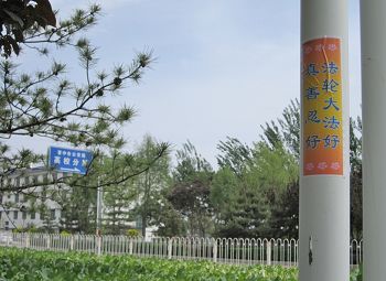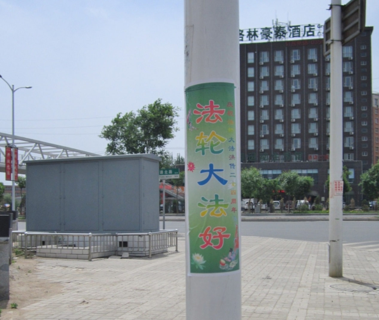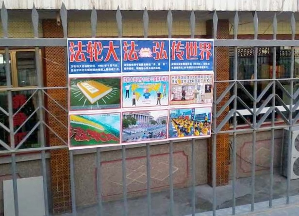 其中“法轮大法好、真善忍好”的真相展板处于锦州市中心,粘贴在最主要、最繁华的大街——中央大街与解放路交叉路口旁正在施工的建筑广告围墙上。当晚路过的行人看见后,就喊“法轮大法好!”
