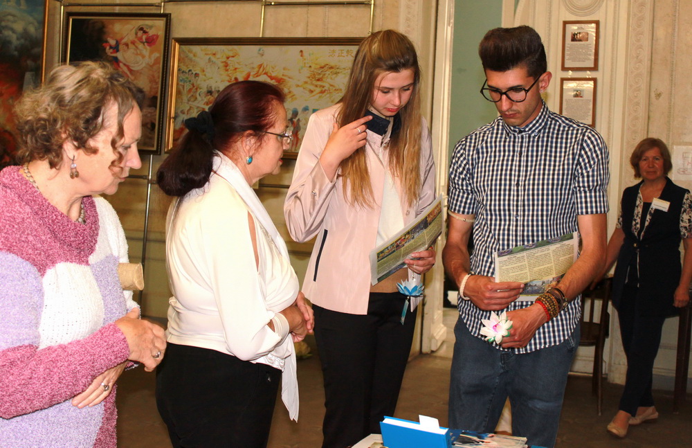 ![]() 图1:法轮功学员在乌克兰哈尔科夫市举办“真善忍”国际美展,参观者倾听画展导览的解说。 |