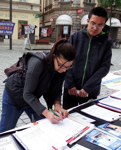 六月十一日,主动到展台前索取资料、聆听真相的德国民众很多,他们主动提出心中疑问,了解为什么中共迫害法轮功及迫害的程度。很多人在举报江泽民器官活摘和反人类罪,群体灭绝罪的征集签名簿上签名。也有些人看到法轮功学员展示的功法很感兴趣,不少人询问各地的炼功点信息,不少人学炼动作之后才走。