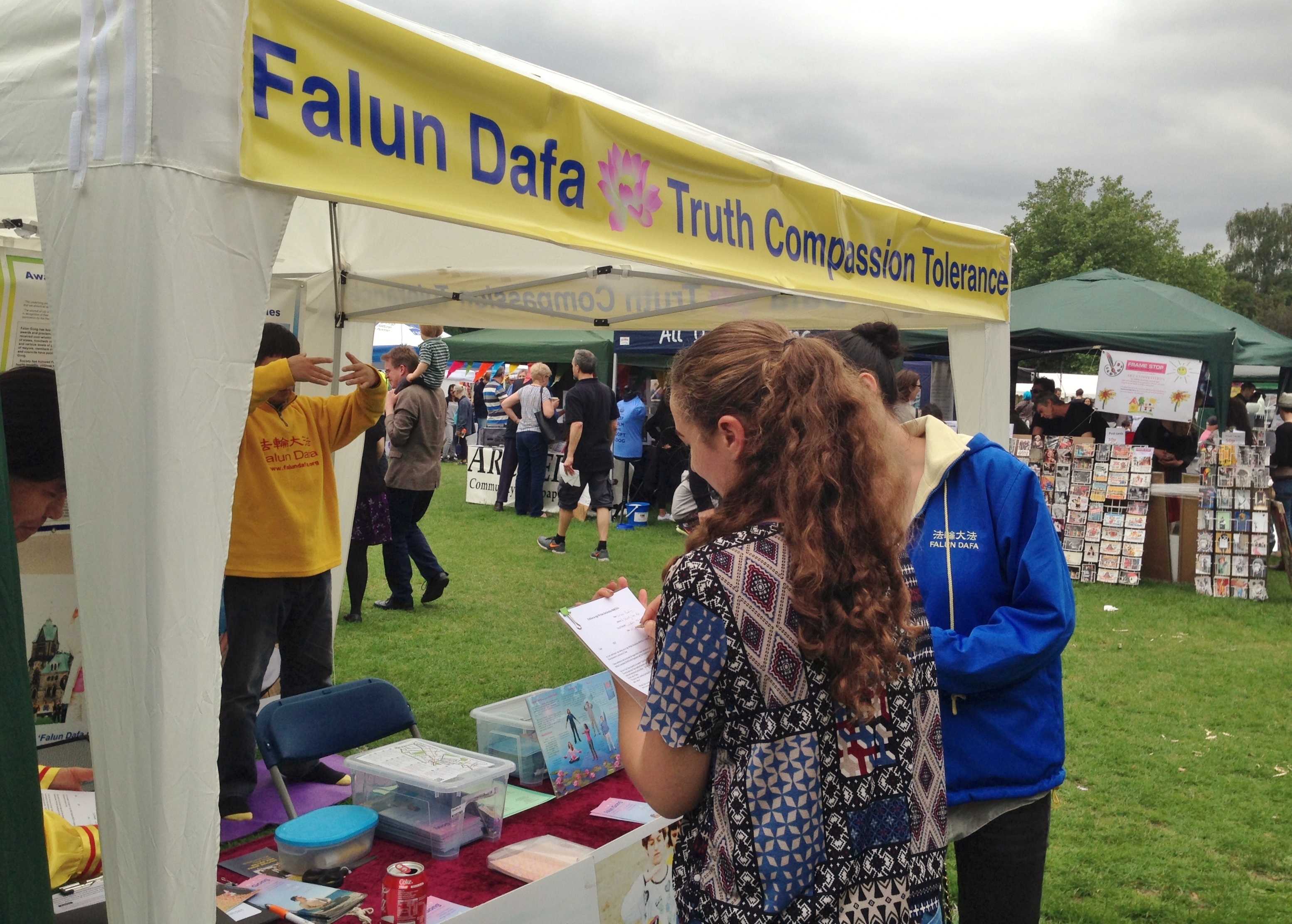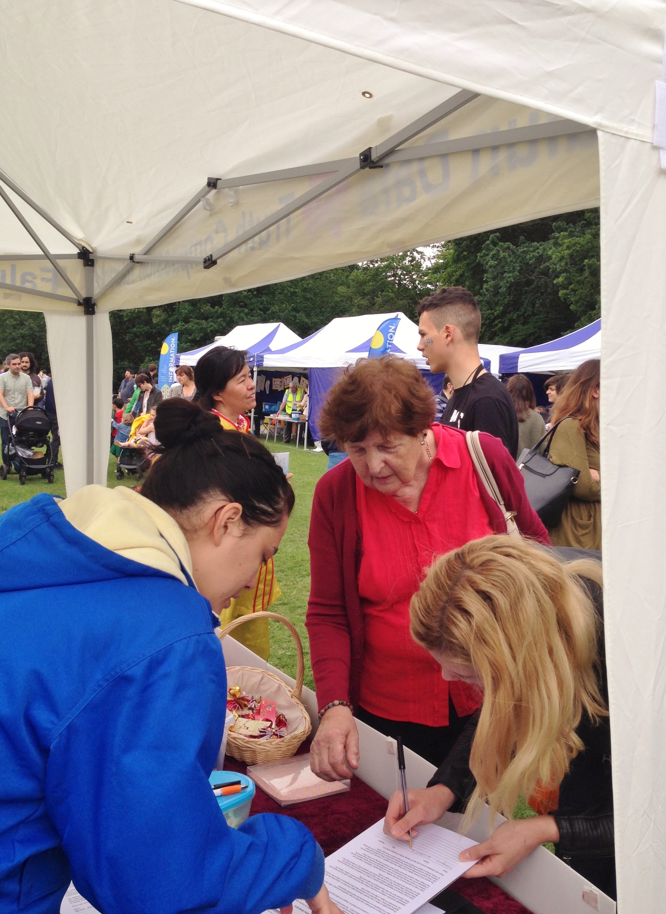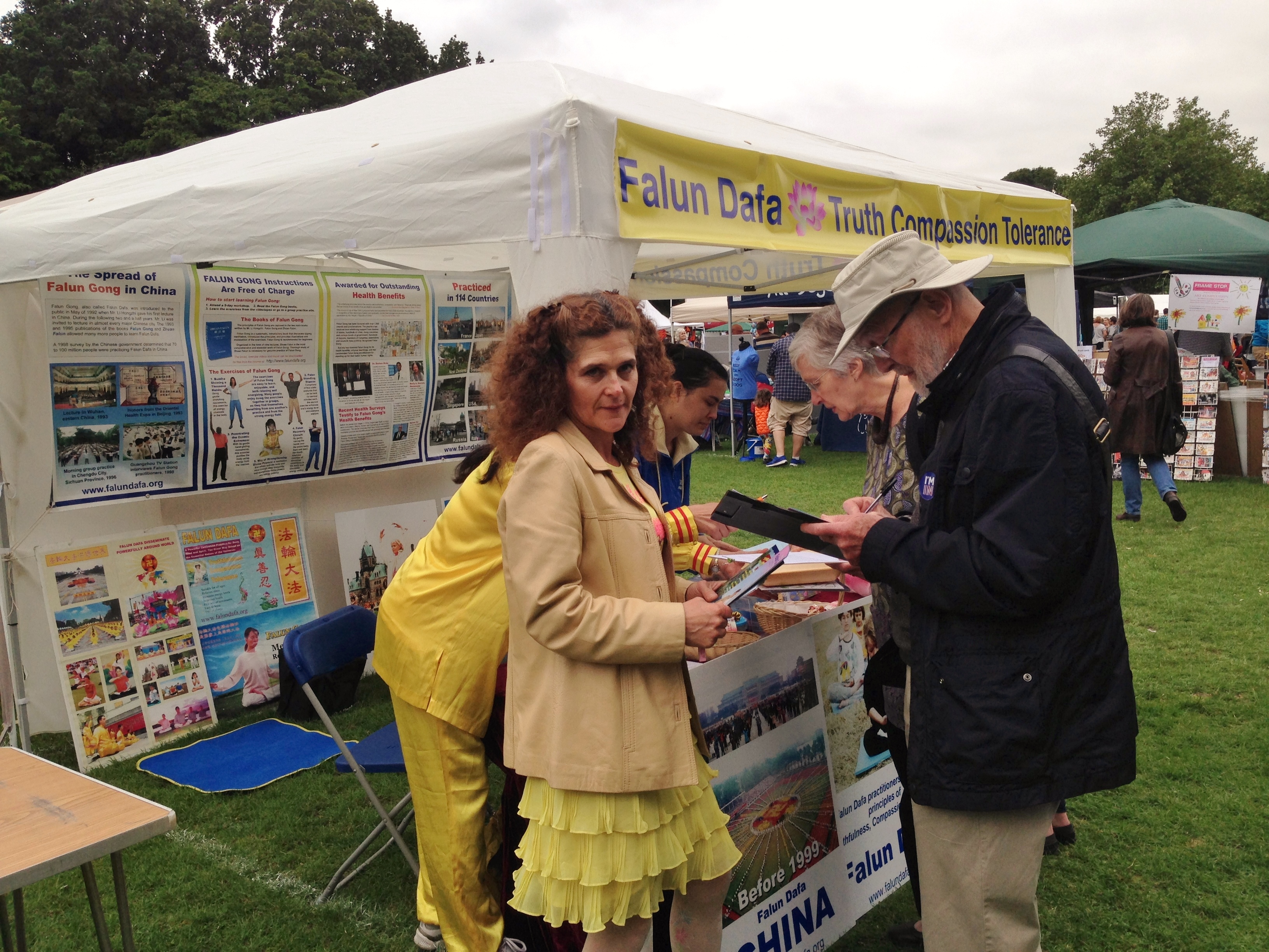 在遍布樱桃树公园的近百个展位中,法轮功展位的宁静祥和仍然是很突出的。法轮功真相传单、法轮功真相展板、优美祥和的炼功音乐、法轮功五套功法展示、学员们舒缓的炼功动作、发放真相传单的法轮功学员、谴责中共迫害法轮功和活摘器官罪恶的征签……这一切,在花园般的东芬诗丽节场地搭建了一个法轮功真相窗口,在这里,有缘人直接向法轮功走来。他(她)们在北伦敦人熟知的社区环境里听闻法轮功真相,不少人现场签名支持法轮功学员反迫害。