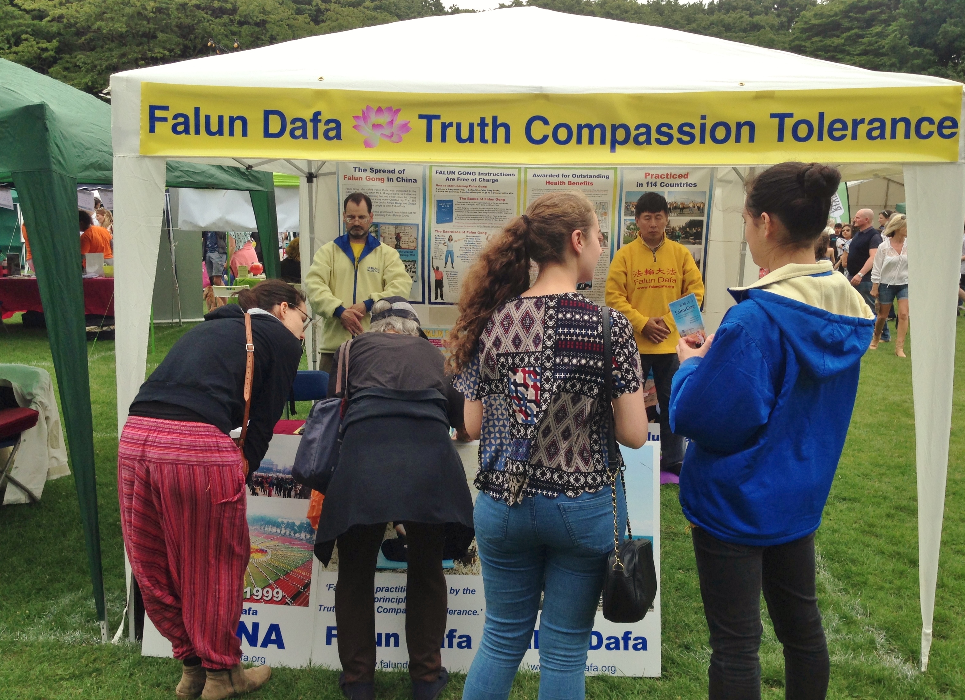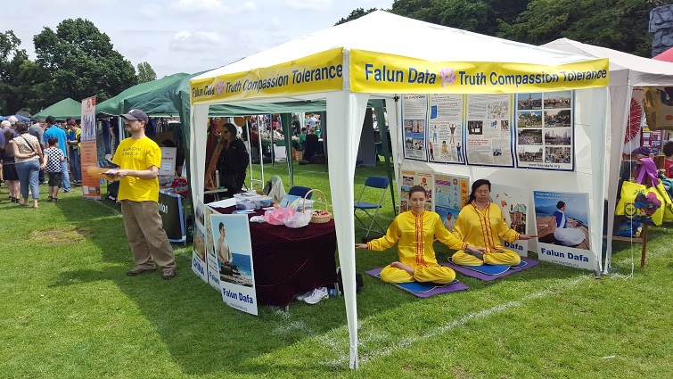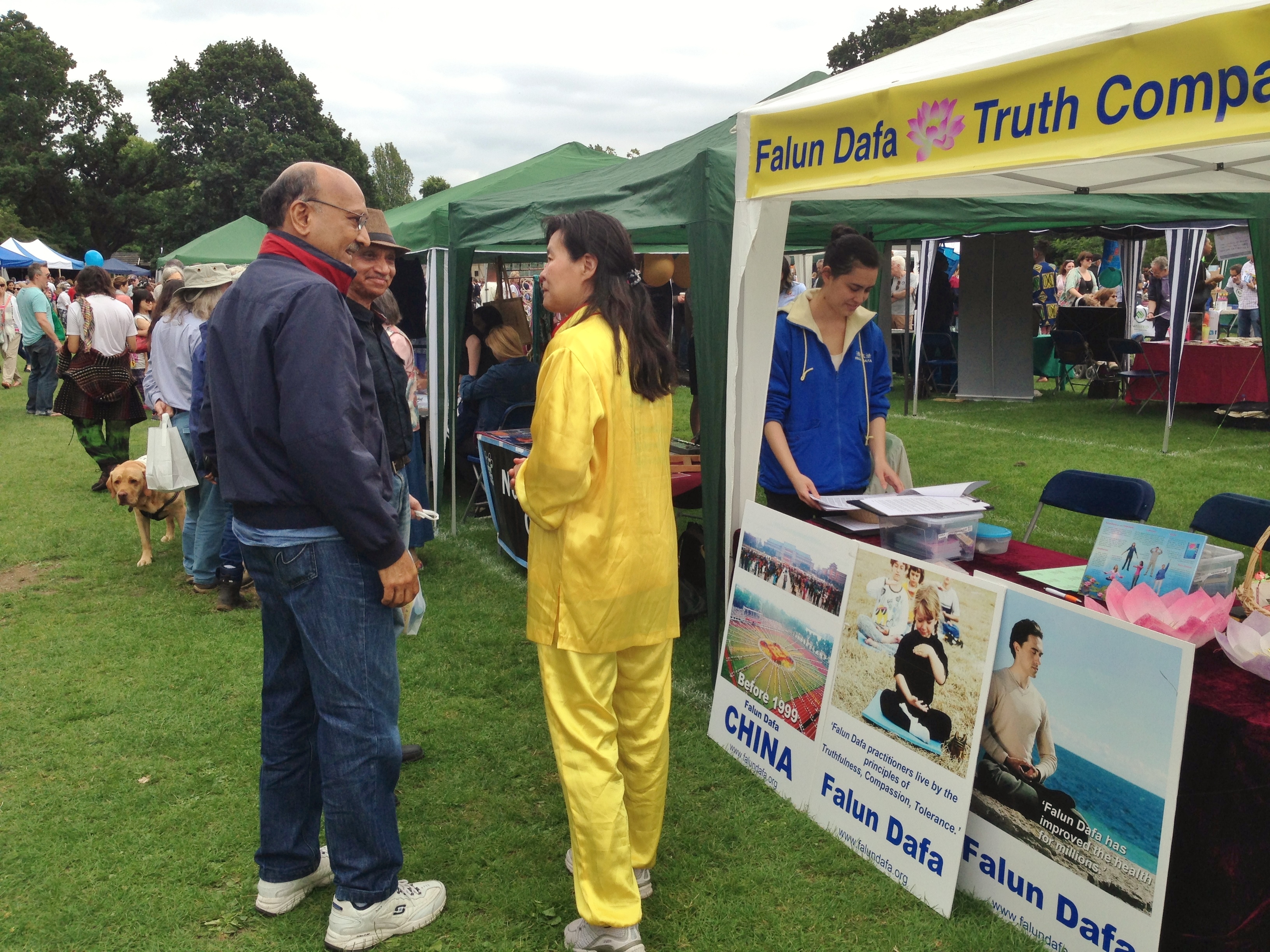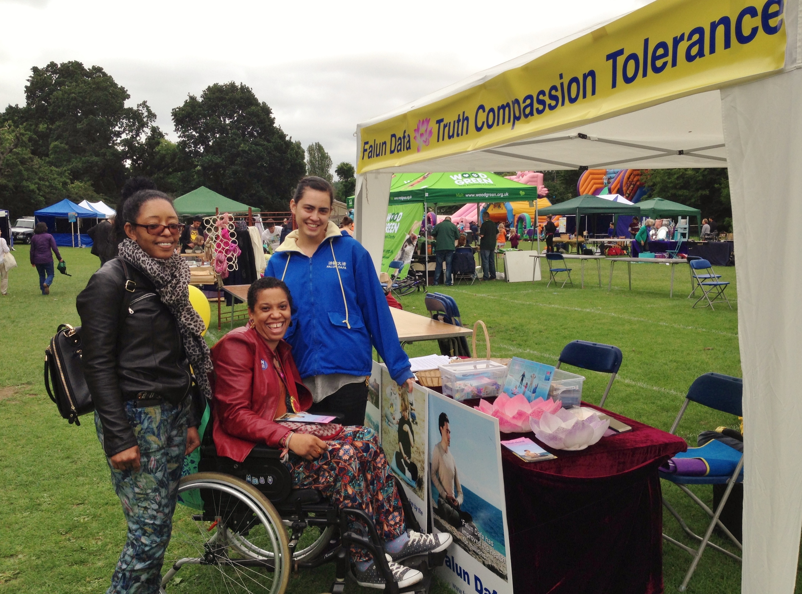 在遍布樱桃树公园的近百个展位中,法轮功展位的宁静祥和仍然是很突出的。法轮功真相传单、法轮功真相展板、优美祥和的炼功音乐、法轮功五套功法展示、学员们舒缓的炼功动作、发放真相传单的法轮功学员、谴责中共迫害法轮功和活摘器官罪恶的征签……这一切,在花园般的东芬诗丽节场地搭建了一个法轮功真相窗口,在这里,有缘人直接向法轮功走来。他(她)们在北伦敦人熟知的社区环境里听闻法轮功真相,不少人现场签名支持法轮功学员反迫害。