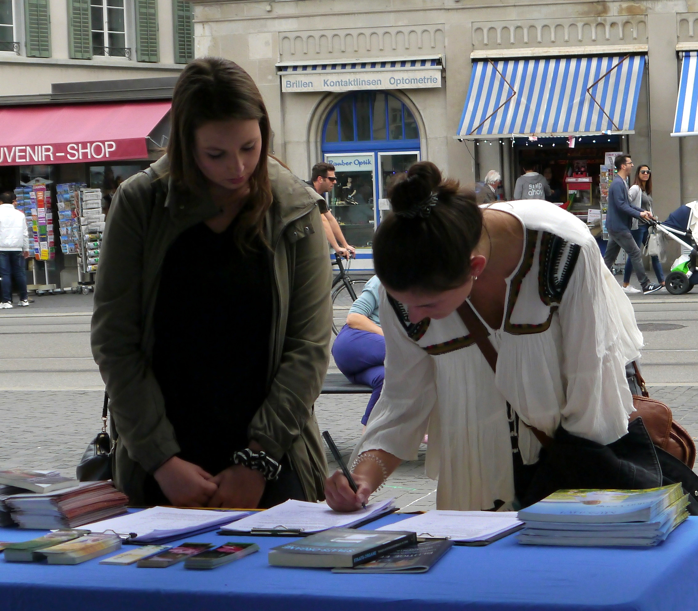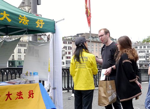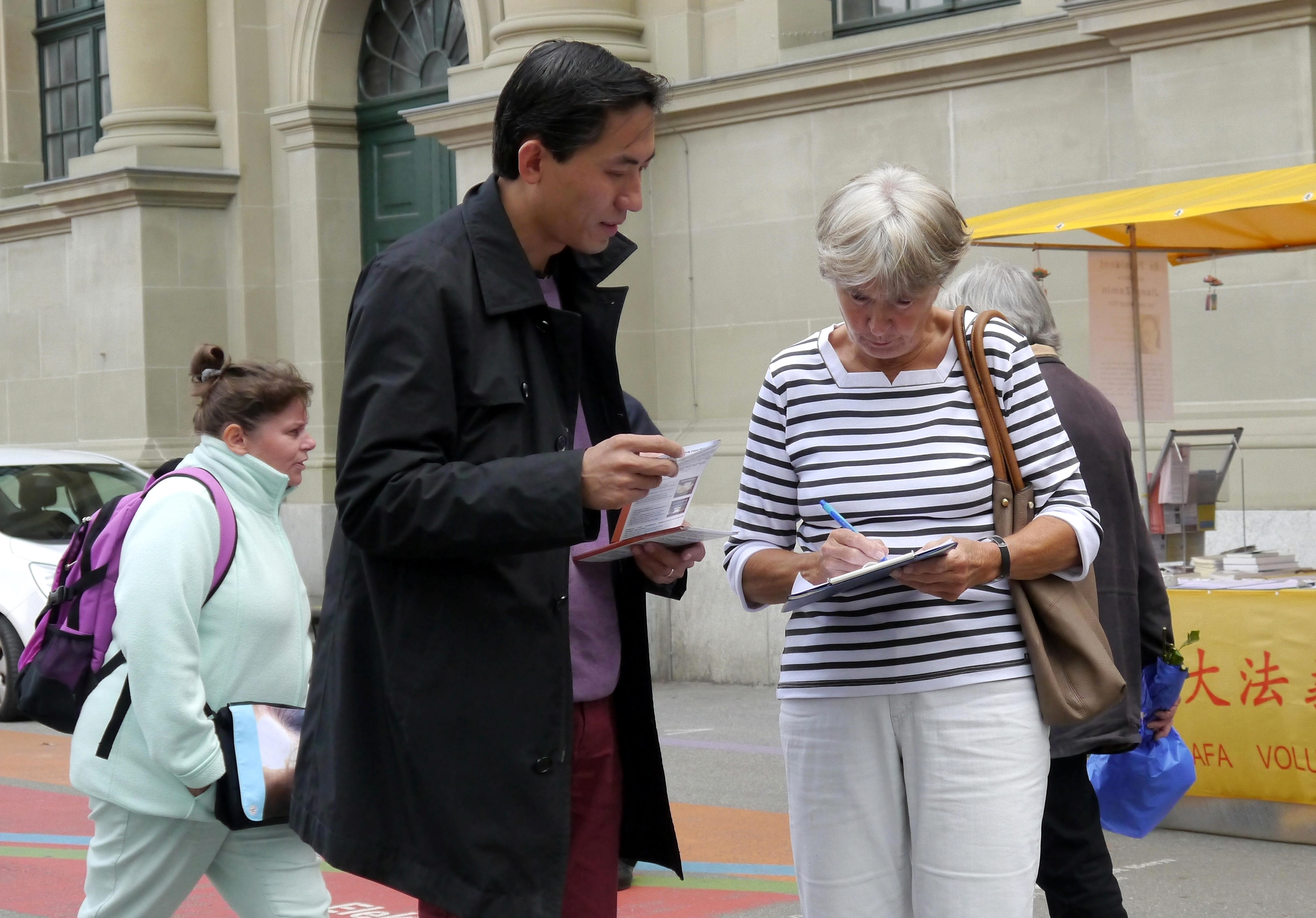 阿尔贝托(Alberto)是来自圣加仑市(St. Gallen)的语言老师。这次在苏黎世他第一次听说中共活摘器官的罪行,他和朋友一起认真地向法轮功学员询问相关的讯息以及法轮功是什么。在签名后他表示:“我希望通过我的签名表达我对(法轮功)的支持,并帮助制止这一切(迫害)。”他并说:“人们应该更多的了解法轮功,可惜在西方不能真正了解在中国发生的很多事。”
