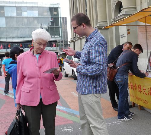 一位路人对法轮功有误解,学员告诉他:“为了给自己无端迫害法轮功找个借口,中共制造了各种谎言污蔑法轮功。很多西方媒体受了中共官方报道的影响,转载了中共对法轮功的诽谤。其实法轮功教人按照‘真善忍’做好人,比如说真话,善待他人,宽宏大量。修炼法轮功让很多人找到了人生的真谛。”在一番交谈后他欣然签名要求制止中共活摘法轮功学员器官。