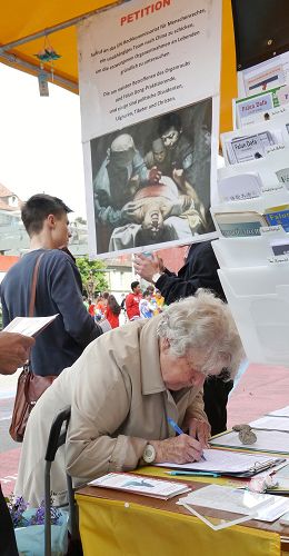 一位已经退休的助产士在签名后认真说:“我反对一切暴力,没有比掠夺器官更恶劣的事情了,所以我签名反对!”她曾听说过法轮功学员被迫害的讯息,她认为这根本不该发生。当得知法轮功教人按照“真善忍”做好人的时候,她赞同地说:“真善忍是正道。”她打算告诉自己的亲朋好友关于中共活摘法轮功学员器官的讯息,让更多人来一起制止这场非人的迫害。