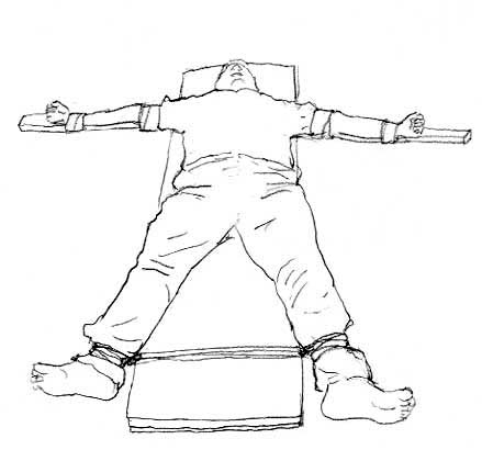 在看守所,对警察的野蛮迫害行径我以绝食的方式予以抵制和反迫害,并要求无条件放人。看守所的恶警对我实施暴力,将我钉在地板上,头上戴上钢盔,两手抻开,用手铐铐上,两脚间支有一长形木方,动不了。两脚被用铁链子钉在地板上,整个人抻成大字,并强行给我灌食,里面竟掺进了让人拉肚子的不明药物,受尽非人的折磨。