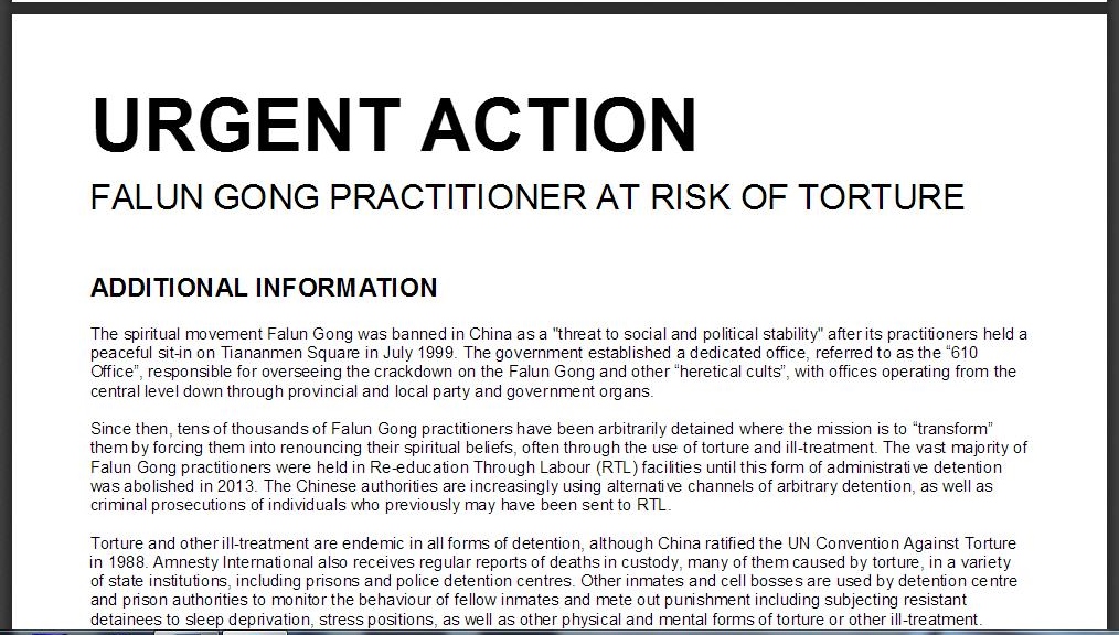 两个多月前,即在二零一六年三月二十九日,国际特赦组织(Amnesty International)在其网站还发布了另一项为中国大陆法轮功学员设立的紧急救援行动(URGENT ACTION)(UA: 73/16 Index: ASA 17/3726/2016 China Date: 29 March 2016),要求中共释放二零一五年十二月在中国大陆河南省因为坚持信仰被非法拘禁的两位法轮功学员高国富和梁欣,希望尊重人权的善良人士和民众帮助他们免受刑事指控、帮助他们免于遭受中共酷刑和其他形式的非人虐待。