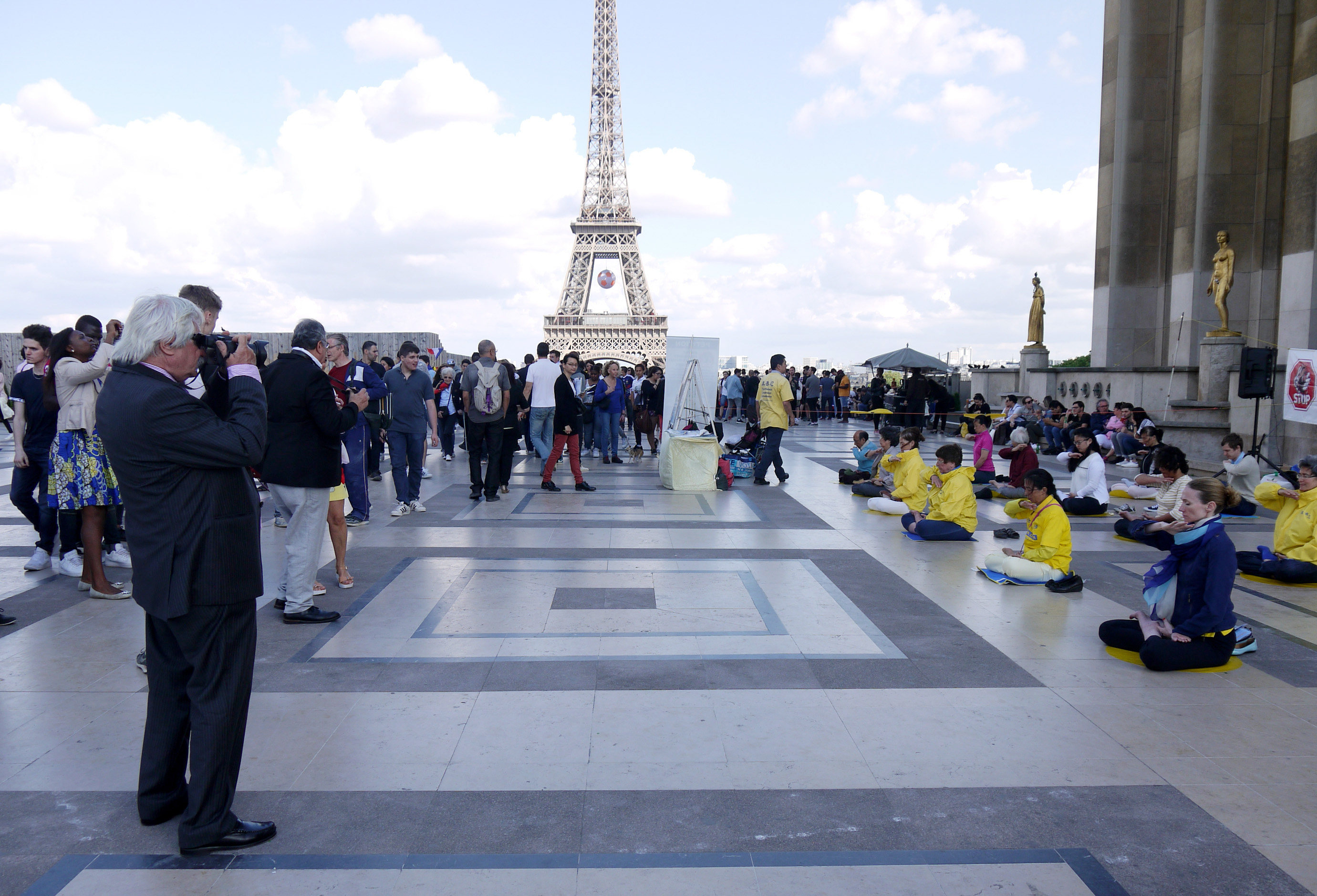 ![]() 图1-3:二零一六年六月二十六日下午,法轮功学员在巴黎艾菲尔铁塔下的人权广场上传播真相。图为法轮功学员祥和的功法场面和真相展板都吸引了中西游客的目光。 |