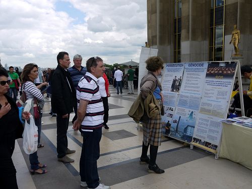下午五时许,正赶上欧洲足球杯一场比赛结束,在铁塔下看大屏幕比赛的人散场,一时间人潮涌动,看到喧嚣闹市的另一边是安静、祥和的法轮功,人们索取法轮功传单,很多人签名支持法轮功反迫害,并合影留念。有的青年当时就想学炼法轮功。