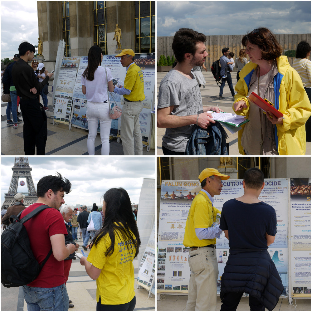 一个年轻的法国女士听说周日有“瑜伽日”就来到人权广场,她没有见到练瑜伽的人,却见到了法轮功。她很高兴碰到法轮功,当场跟着学员学炼了三遍五套功法,并记下了巴黎炼功点的地址,准备去炼功点炼功。