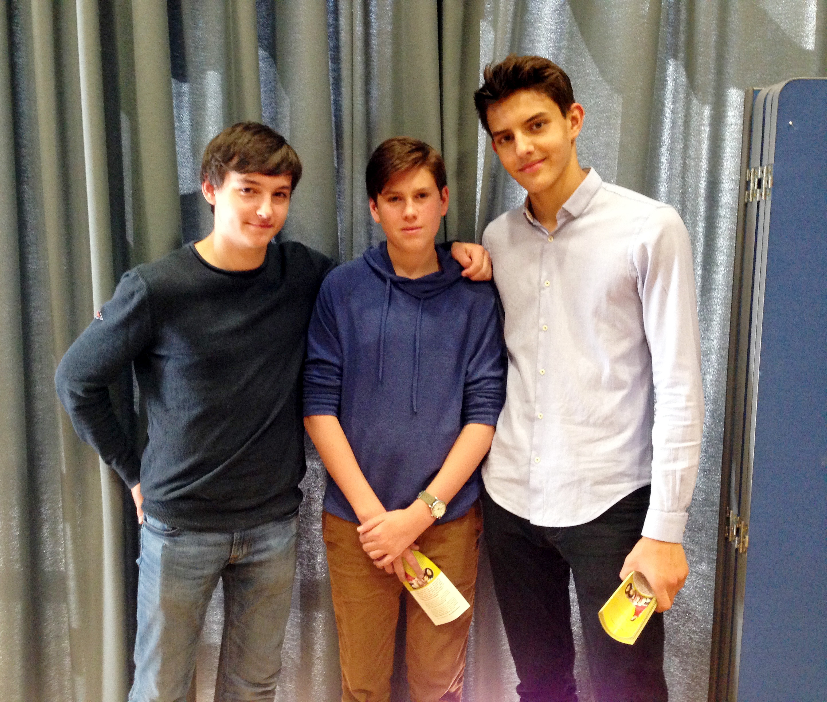 ![]() 图:二零一六年五月二十六日,戴高乐公立中学的费利克斯(右)、马丁(左)与他们的好朋友奥利佛(中)在法轮功真相展示会后合影 |