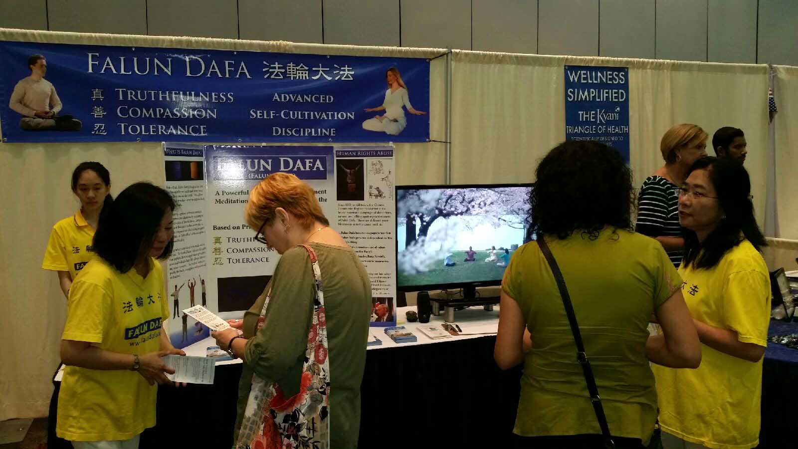 阿曼达是位中年西班亚裔女士,她在展位前与学员交谈了很久,了解了许多详细情况,也讲了自己的经历,她感到法轮功会对她的身心有很大的帮助。